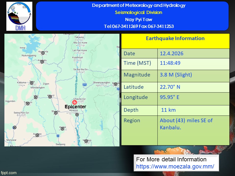 ဗဟိုချက်တည်နေရာ - ကန့်ဘလူမြို့၏ အရှေ့တောင်ဘက် (၄၃)မိုင်ခန့်