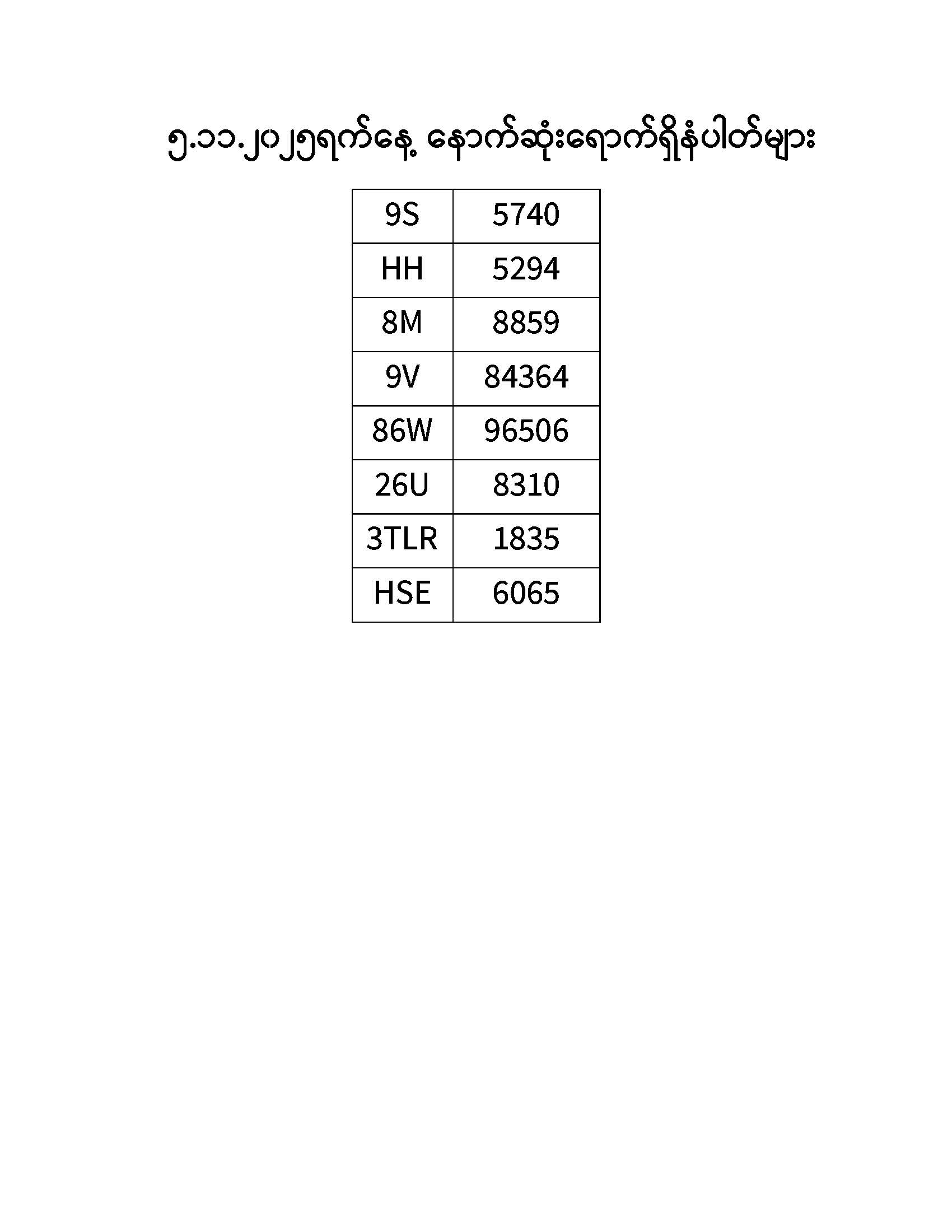 ၅.၁၁.၂၀၂၅ ရက်နေ့ထိ နောက်ဆုံးရောက်ရှိ နံပါတ်များ Published: 06 Nov, 2025 Place: ကုန်းလမ်းပို့ဆောင်ရေးညွှန်ကြားမှုဦးစီးဌာန