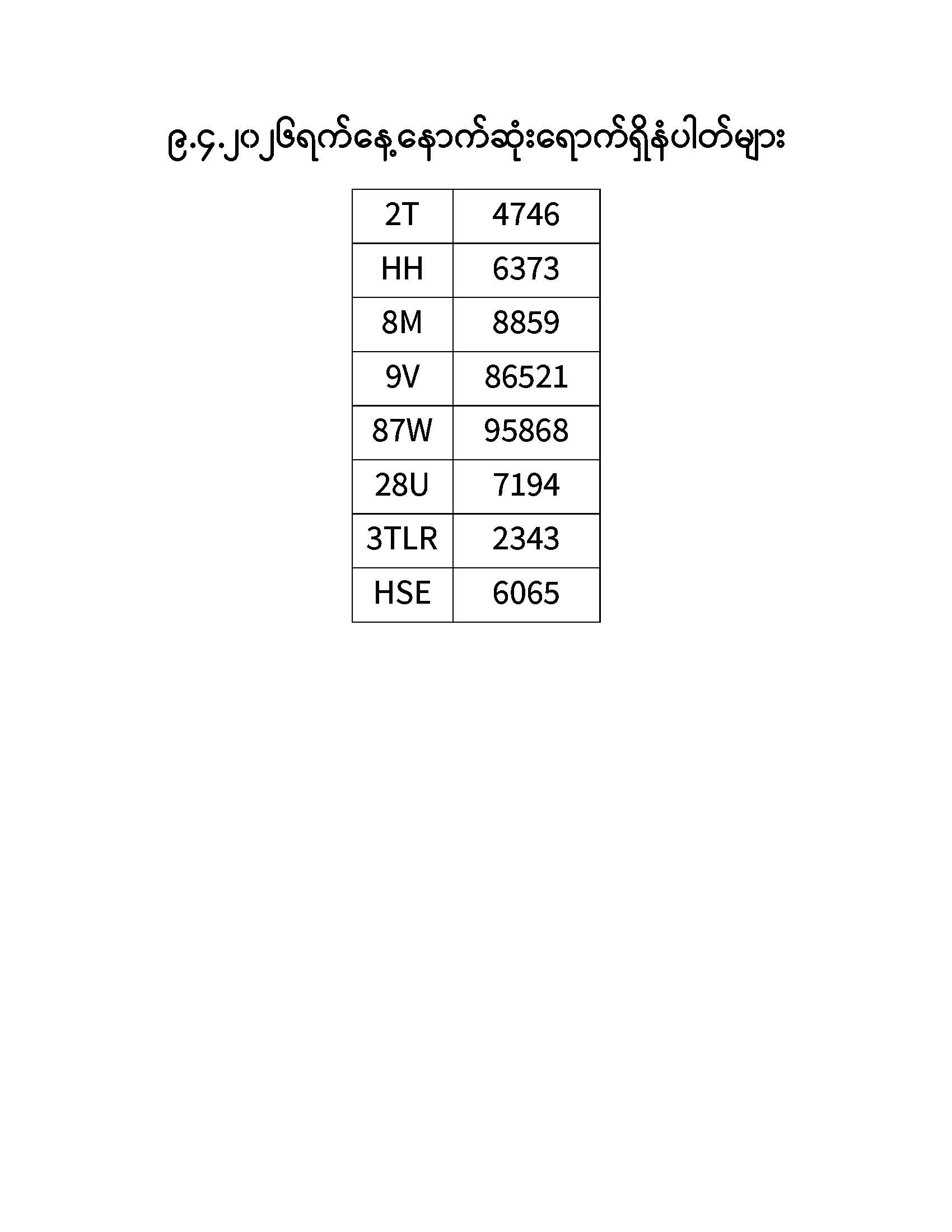 ၇.၄.၂၀၂၆ ရက်နေ့ထိ နောက်ဆုံးရောက်ရှိ နံပါတ်များ Published: 09 Apr, 2026 Place: ကုန်းလမ်းပို့ဆောင်ရေးညွှန်ကြားမှုဦးစီးဌာန