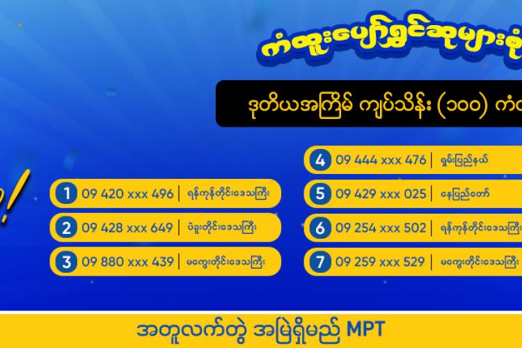 MPT က “ကံထူးပျော်ရွှင် ဆုများစုံလင်” အစီအစဉ်၏ ဇန်နဝါရီလအတွက် ကျပ်သိန်း (၁၀၀) ကံထူးရှင် (၁၀)ဦးကို ထပ်မံကြေညာ