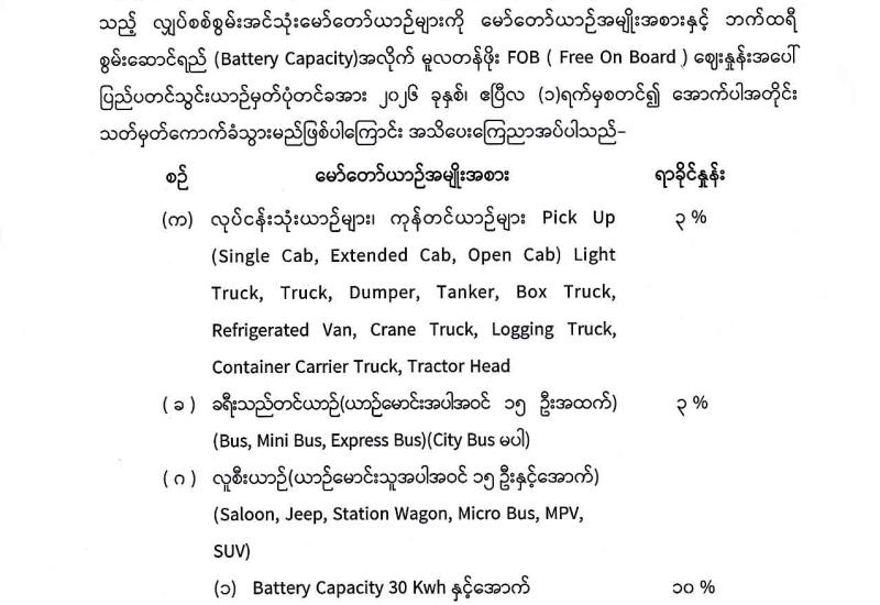 မော်တော်ယာဉ်အမျိုးအစားနှင့် ဘက်ထရီစွမ်းဆောင်ရည်(Battery Capcity)အလိုက်မူလတန်ဖိုးFOBဈေးနှုန်းအပေါ်ပြည်ပတင်သွင်းယာဉ်မှတ်ပုံတင်ခအား၂၀၂၆ခုနှစ်၊ဧပြီလ(၁)ရက်မှစတင်၍အောက်ပါအတိုင်းသတ်မှတ်ကောက်ခံသွားမည်ဖြစ်ပါကြောင်းအသိပေးကြေညာအပ်ပါသည်