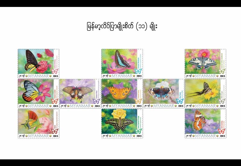 ပို့ဆောင်ရေးနှင့်ဆက်သွယ်ရေးဝန်ကြီးဌာန၊ မြန်မာ့စာတိုက်လုပ်ငန်းမှ ထုတ်ဝေခဲ့ပြီးသော မြန်မာနိုင်ငံ၌တွေ့ရှိရသည့် လိပ်ပြာမျိုးစိတ်(၁၁)မျိုး တံဆိပ်ခေါင်းများကို တံဆိပ်ခေါင်း စုဆောင်းသူ ဝါသနာရှင်များ တစ်စု တစ်စည်းတည်း စုဆောင်းနိုင်ကြရန် ရည်ရွယ်၍ မြန်မာ့လိပ်ပြာမျိုးစိတ် ၂၀၀ ကျပ်တန် (၁၁)လုံးပါ Block of Stamp အထူးထုတ် စာပို့တံဆိပ်ခေါင်း သစ် (၁)မျိုးအား ၂၀၂၅ ခုနှစ်၊ စက်တင်ဘာလ (၂၀)ရက်၊ မြန်မာသက္ကရာဇ် ၁၃၈၇ ခုနှစ်၊ တော်သလင်းလပြည့်ကျော် (၁၄)ရက် (စနေနေ့) နံနက် (၀၉:၃၀)နာရီ အချိန်မှစတင်၍ နေပြည်တော်ဗဟို စာတိုက်ကြီး၊ ရန်ကုန်စာတိုက်ကြီး၊ မန္တလေးစာတိုက်ကြီးတို့နှင့် တိုင်းဒေသကြီး/ ပြည်နယ်များရှိ စာတိုက်ကြီးများတွင် တစ်ပြိုင်တည်း ရောင်းချပေးသွားမည်ဖြစ်ပါသည်။