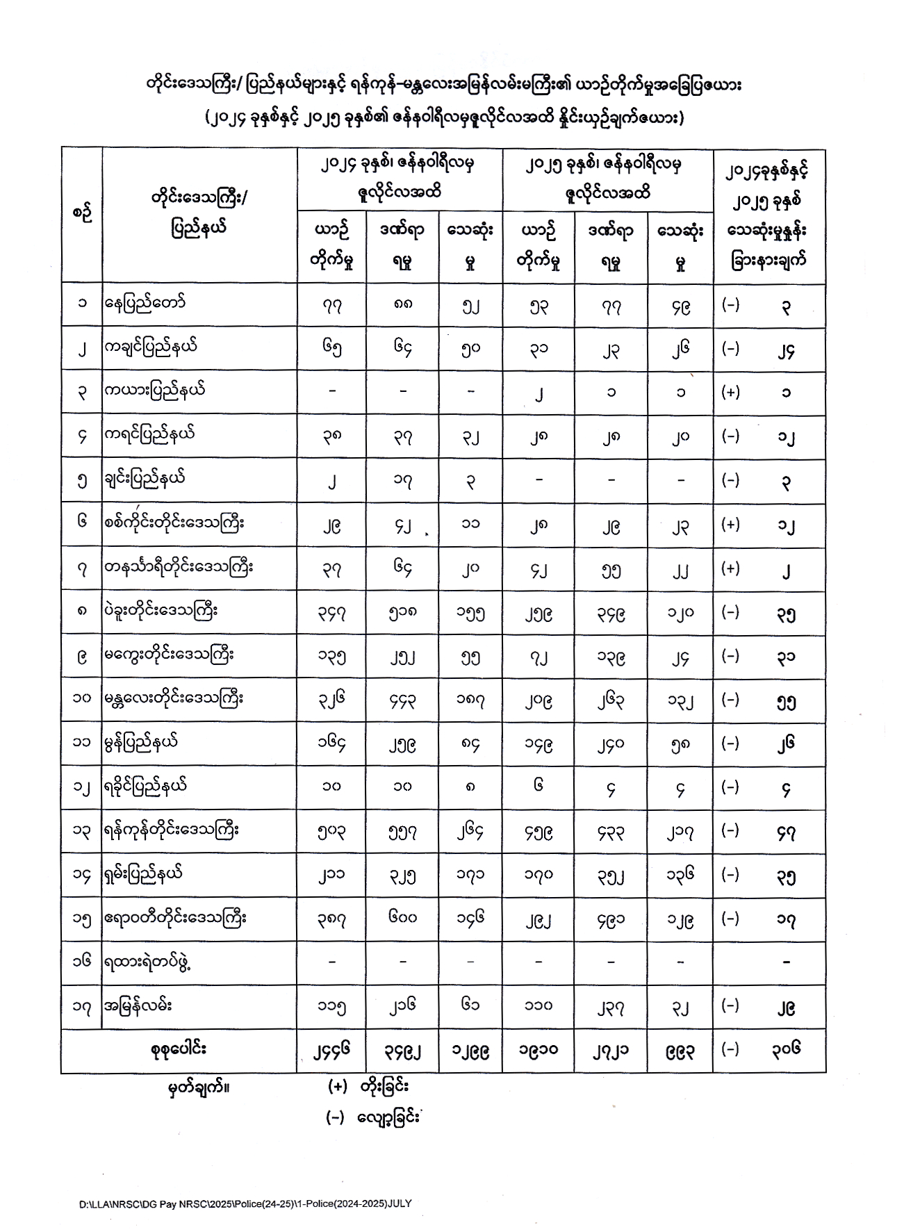 တိုင်းဒေသကြီး/ ပြည်နယ်များနှင့် ရန်ကုန်-မန္တလေးအမြန်လမ်းမကြီး၏ ယာဉ်တိုက်ခိုက်မှု အခြေပြဇယား(၂၀၂၄ ခုနှစ်နှင့် ၂၀၂၅ခုနှစ်၏ ဇန်နဝါရီလ မှ ဇူလိုင်လအထိ နှိုင်းယှဉ်ချက်ဇယား) Published: 26 Aug, 2025 Place: ကုန်းလမ်းပို့ဆောင်ရေးညွှန်ကြားမှုဦးစီးဌာန