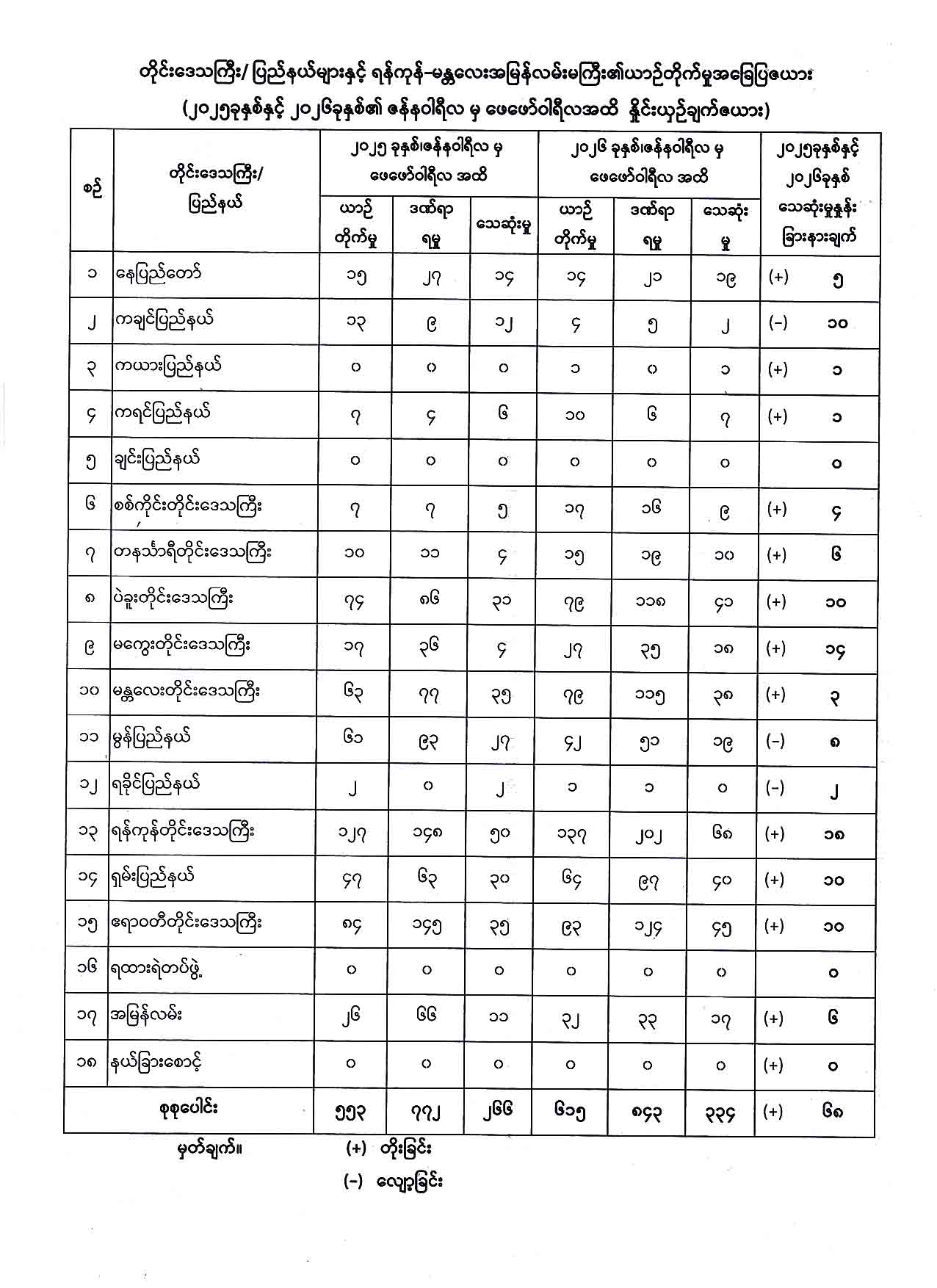 တိုင်းဒေသကြီး/ ပြည်နယ်များနှင့် ရန်ကုန်-မန္တလေးအမြန်လမ်းမကြီး၏ ယာဉ်တိုက်ခိုက်မှု အခြေပြဇယား(၂၀၂၅ ခုနှစ်နှင့် ၂၀၂၆ခုနှစ်၏ ဇန်နဝါရီလ မှ ဖေဖော်ဝါရီလအထိ နှိုင်းယှဉ်ချက်ဇယား) Published: 06 Apr, 2026 Place: ကုန်းလမ်းပို့ဆောင်ရေးညွှန်ကြားမှုဦးစီးဌာန