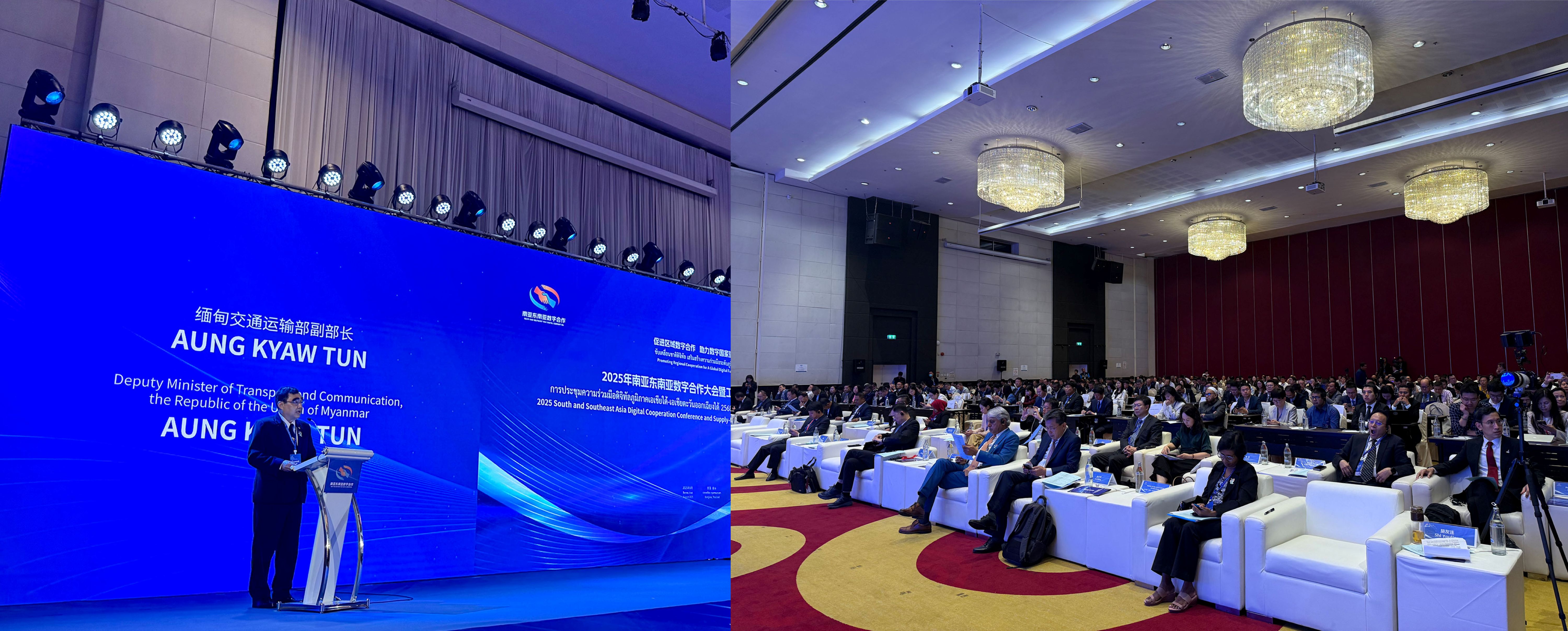 ပို့ဆောင်ရေးနှင့်ဆက်သွယ်ရေးဝန်ကြီးဌာန ဒုတိယဝန်ကြီး ဦးအောင်ကျော်ထွန်းသည် ပညာရေးဝန်ကြီးဌာန၊ အဆင့်မြင့်ပညာဦးစီးဌာန၊ စိုက်ပျိုးရေးဦးစီးဌာန၊ ဆက်သွယ်ရေးညွှန်ကြားမှုဦးစီးဌာန၊ ကျန်းမာရေးဝန်ကြီးဌာနတို့မှ တာဝန်ရှိသူများနှင့်အတူ ထိုင်းနိုင်ငံ၊ ဘန်ကောက်မြို့တွင် ကျင်းပပြုလုပ်သည့် ၂၀၂၅ ခုနှစ် တောင်နှင့် တောင်အာရှနိုင်ငံများ ဒစ်ဂျစ်တယ်ပူးပေါင်းဆောင်ရွက်ရေး ကွန်ဖရင့်၊ နိုင်ငံတကာ ချိတ်ဆက်မှုများနှင့် ဒစ်ဂျစ်တယ်ထုတ်ကုန်များ ကုန်သွယ်ရောင်းဝယ်ခြင်း အခမ်းအနား (2025 South and Southeast Asia Digital Cooperation Conference and Supply and Demand Matchmaking Event for the Industry and Trade) သို့ တက်ရောက် အမှာစကားပြောကြားပါသည်။
