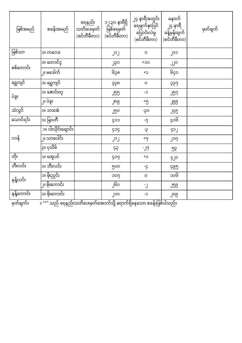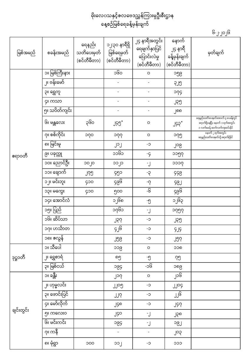 နေ့စဉ်မြစ်ရေခန့်မှန်းချက် Published: 06 Feb, 2026 Place: မိုးလေဝသနှင့်ဇလဗေဒညွှန်ကြားမှုဦးစီးဌာန မိုးလေဝသနှင့်ဇလဗေဒညွှန်ကြားမှုဦးစီးဌာနနေ့စဉ်မြစ်ရေခန့်မှန်းချက် ၆-၂-၂၀၂၆ ရက်နေ့ ၁၄:၀၀ နာရီအချိန်ထုတ်ပြန်ချက် (၅.၂.၂၀၂၆) မြစ်ရေခန့်မှန်းချက်(၄.၂.၂၀၂၆) မြစ်ရေခန့်မှန်းချက်(၃.၂.၂၀၂၆) မြစ်ရေခန့်မှန်းချက်