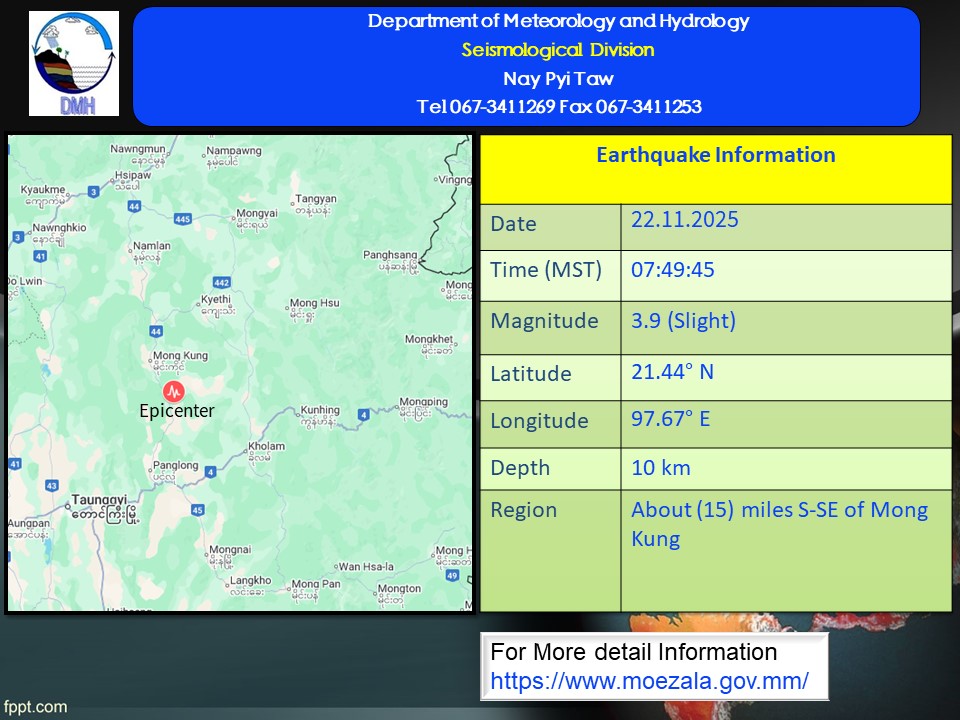 ၂၀၂၅ ခုနှစ်၊ နိုဝင်ဘာလ ၂၂ ရက်နေ့၊ မြန်မာစံတော်ချိန် (၀၇) နာရီ၊ (၄၉) မိနစ်၊ (၄၅) စက္ကန့်အချိန်တွင် တောင်ကြီးမြေငလျင်စခန်းမှ အရှေ့မြောက်ဘက် (၆၃) မိုင်ခန့်ကွာဝေးသော မြန်မာနိုင်ငံ ပြည်တွင်း (မိုင်းကိုင်မြို့၏ တောင်-အရှေ့တောင်ဘက် (၁၅) မိုင်ခန့်ကွာ) မြောက်လတ္တီတွဒ် (၂၁.၄၄) ဒီဂရီ၊ အရှေ့လောင်ဂျီတွဒ် (၉၇.၆၇) ဒီဂရီ၊ အနက် (၁၀) ကီလို မီတာကို ဗဟိုပြု၍ အင်အား ရစ်(ခ်)တာစကေး (၃.၉) အဆင့်ရှိ အင်အားအနည်းငယ်ရှိသော မြေငလျင်တစ်ခု လှုပ်ရှားသွားကြောင်း တိုင်းထွာရရှိပါသည်။