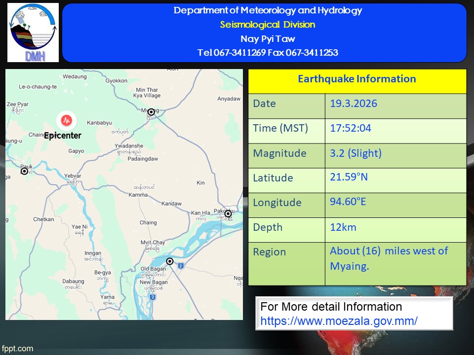 ၂၀၂၆ ခုနှစ်၊ မတ်လ ၁၉ ရက်နေ့၊ မြန်မာစံတော်ချိန် (၁၇)နာရီ၊ (၅၂)မိနစ်၊ (၀၄) စက္ကန့် အချိန်တွင် ညောင်ဦးမြေငလျင်စခန်းမှ အနောက်မြောက်ဘက် (၃၄) မိုင် ခန့်ကွာဝေးသော မြန်မာနိုင်ငံပြည်တွင်း (မြိုင်မြို့၏ အနောက်ဘက် မိုင် (၁၆) ခန့်အကွာ)၊ မြောက်လတ္တီတွဒ် (၂၁.၅၉) ဒီဂရီ၊ အရှေ့လောင်ဂျီတွဒ် (၉၄.၆၀) ဒီဂရီ၊ အနက် (၁၂) ကီလိုမီတာကို ဗဟိုပြု၍ အင်အားရစ်(ခ်)တာ စကေး (၃.၂) အဆင့်ရှိ အင်အားအနည်းငယ်ရှိသော မြေငလျင်တစ်ခု လှုပ်ရှား သွားကြောင်းတိုင်းထွာရရှိပါသည်။