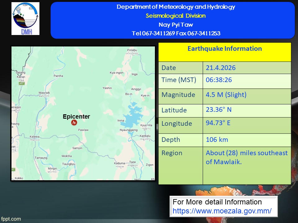 ၂၀၂၆ ခုနှစ်၊ ဧပြီလ ၂၁ ရက်နေ့၊ မြန်မာစံတော်ချိန် (၀၆)နာရီ၊ (၃၈)မိနစ်၊ (၂၆)စက္ကန့် အချိန်တွင် ကန့်ဘလူမြေငလျင်စခန်းမှ အနောက်-အနောက်မြောက်ဘက် (၅၁) မိုင်ခန့် ကွာဝေး သော မြန်မာနိုင်ငံပြည်တွင်း (မော်လိုက်မြို့၏ အရှေ့တောင်ဘက် (၂၈) မိုင်ခန့်အကွာ)၊ မြောက် လတ္တီတွဒ် (၂၃.၃၆) ဒီဂရီ၊ အရှေ့လောင်ဂျီတွဒ် (၉၄.၇၃) ဒီဂရီ၊ အနက် (၁၀၆) ကီလိုမီတာကို ဗဟိုပြု၍ ပမာဏ ၄.၅(M) အဆင့်ရှိ အင်အားအနည်းငယ်ရှိသော မြေငလျင်တစ်ခု လှုပ်ရှားသွား ကြောင်း တိုင်းထွာရရှိပါသည်။