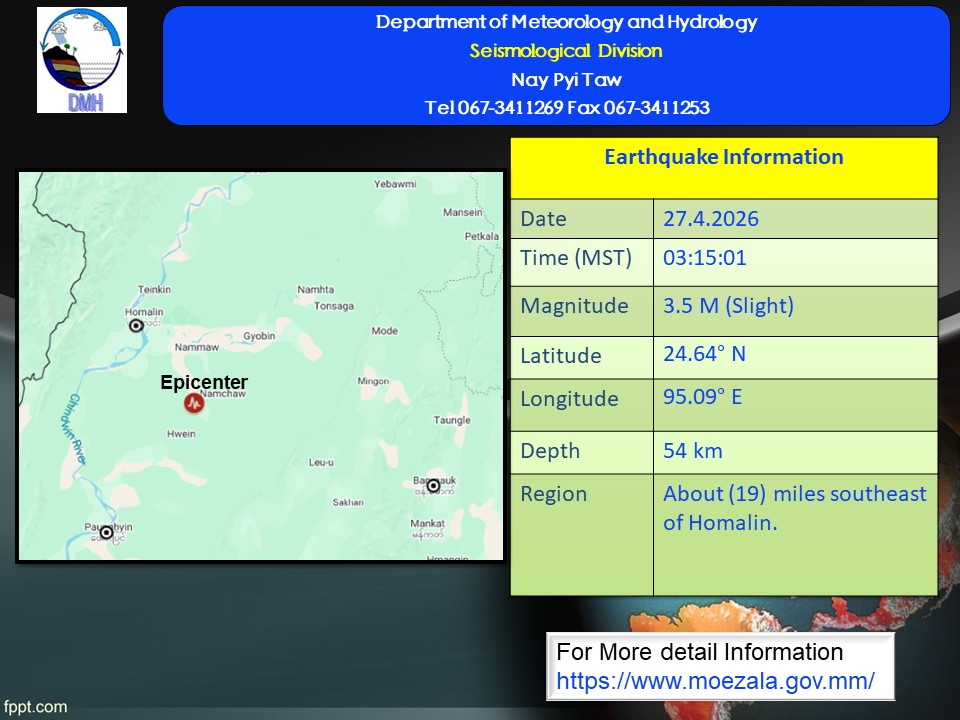 ၂၀၂၆ ခုနှစ်၊ ဧပြီလ ၂၇ ရက်နေ့၊ မြန်မာစံတော်ချိန် (၀၃)နာရီ၊ (၁၅)မိနစ်၊ (၀၁)စက္ကန့် အချိန်တွင် တမူးမြေငလျင်စခန်းမှ အရှေ့မြောက်ဘက် (၅၇) မိုင်ခန့် ကွာဝေးသော မြန်မာနိုင်ငံ ပြည်တွင်း (ဟုမ္မလင်းမြို့၏ အရှေ့တောင်ဘက် (၁၉) မိုင်ခန့်အကွာ)၊ မြောက်လတ္တီတွဒ် (၂၄.၆၄) ဒီဂရီ၊ အရှေ့လောင်ဂျီတွဒ် (၉၅.၀၉) ဒီဂရီ၊ အနက် (၅၄) ကီလိုမီတာကို ဗဟိုပြု၍ ပမာဏ ၃.၅(M) အဆင့်ရှိ အင်အားအနည်းငယ်ရှိသော မြေငလျင်တစ်ခု လှုပ်ရှားသွားကြောင်း တိုင်းထွာရရှိပါသည်။