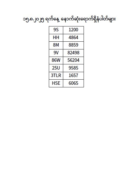 ၁၅.၈.၂၀၂၅ ရက်နေ့ထိ နောက်ဆုံးရောက်ရှိ နံပါတ်များ Published: 18 Aug, 2025 Place: ကုန်းလမ်းပို့ဆောင်ရေးညွှန်ကြားမှုဦးစီးဌာန