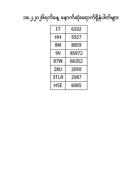 ၁၈.၂.၂၀၂၆ ရက်နေ့ထိ နောက်ဆုံးရောက်ရှိ နံပါတ်များ Published: 19 Feb, 2026 Place: ကုန်းလမ်းပို့ဆောင်ရေးညွှန်ကြားမှုဦးစီးဌာန