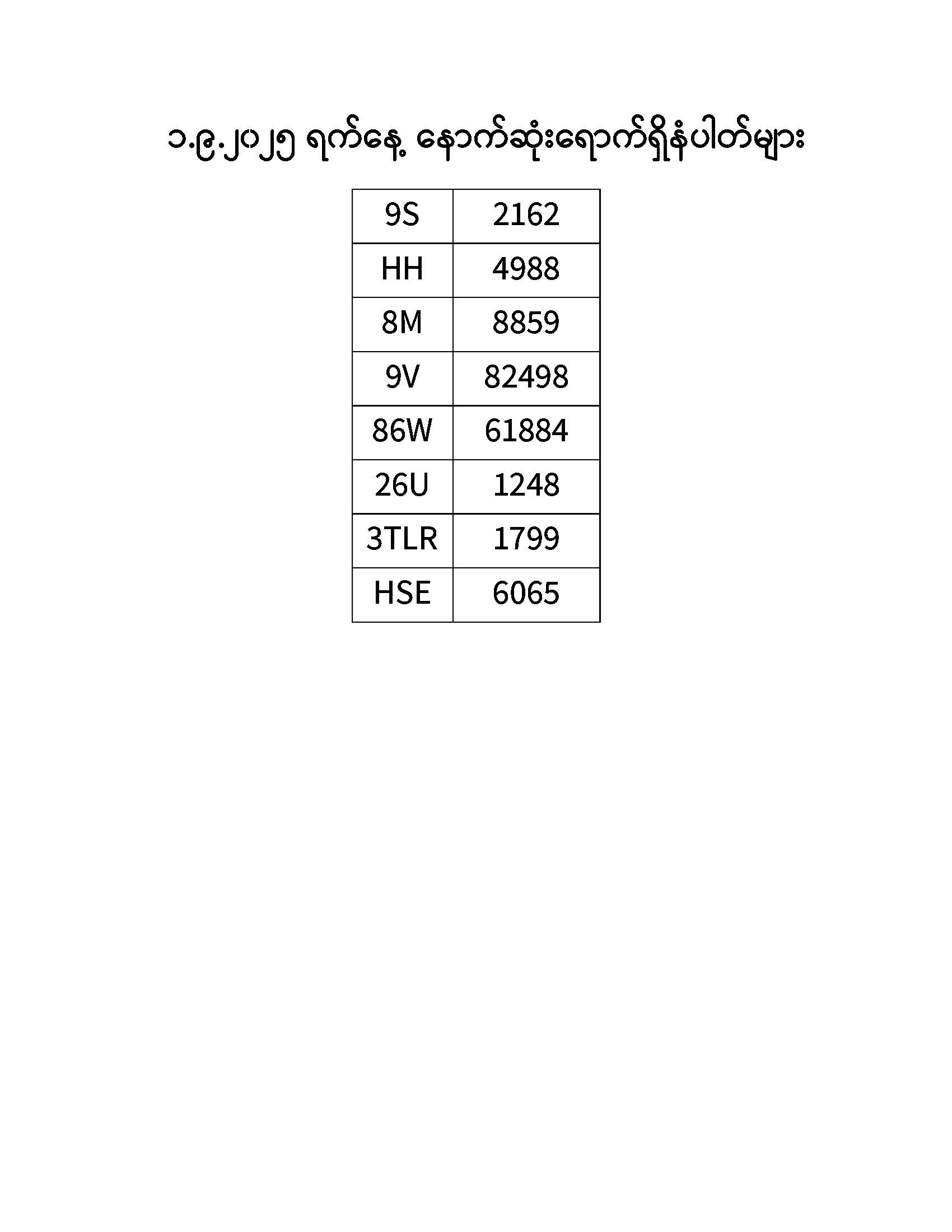 ၁.၉.၂၀၂၅ ရက်နေ့ထိ နောက်ဆုံးရောက်ရှိ နံပါတ်များ Published: 02 Sep, 2025 Place: ကုန်းလမ်းပို့ဆောင်ရေးညွှန်ကြားမှုဦးစီးဌာန