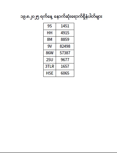 ၁၉.၈.၂၀၂၅ ရက်နေ့ထိ နောက်ဆုံးရောက်ရှိ နံပါတ်များ Published: 20 Aug, 2025 Place: ကုန်းလမ်းပို့ဆောင်ရေးညွှန်ကြားမှုဦးစီးဌာန