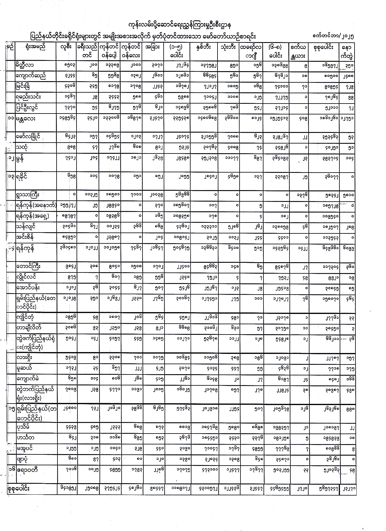 ၂၀၂၅ ခုနှစ်၊ စက်တင်ဘာလအထိ ပြည်နယ်တိုင်းခရိုင်ရုံးများတွင် အမျိုးအစားအလိုက် မှတ်ပုံတင်ထားသော မော်တော်ယာဉ်စာရင်း Published: 02 Oct, 2025 Place: ကုန်းလမ်းပို့ဆောင်ရေးညွှန်ကြားမှုဦးစီးဌာန