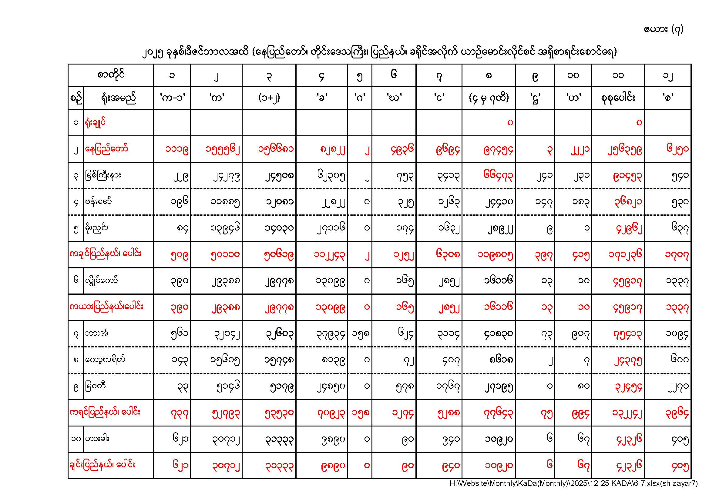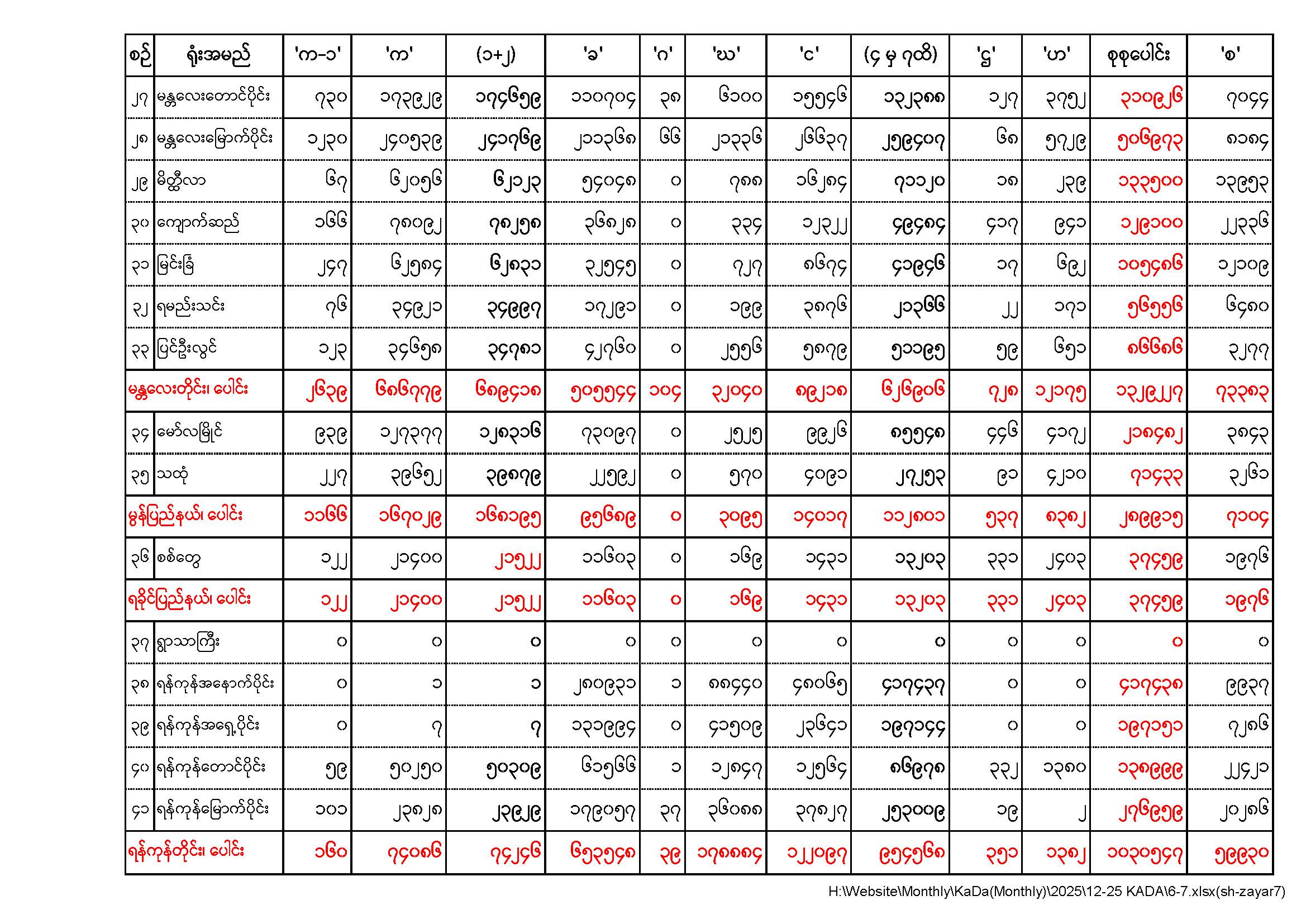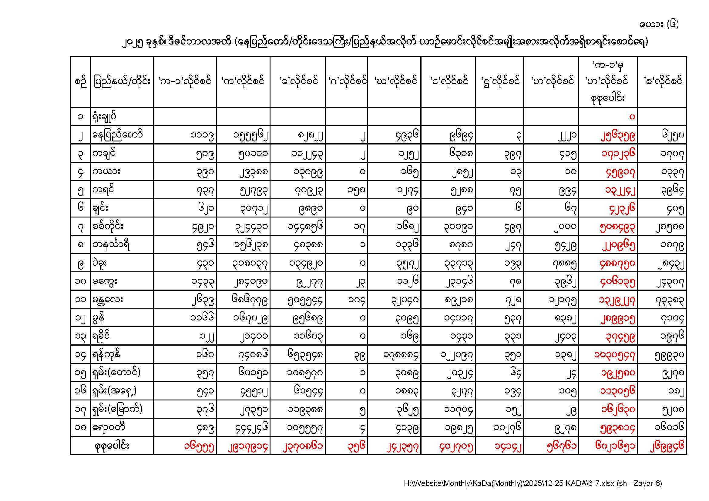 ၂၀၂၅ ခုနှစ်၊ ဒီဇင်ဘာလ အထိ (နေပြည်တော်/တိုင်းဒေသကြီး/ပြည်နယ်အလိုက် ယာဉ်မောင်းလိုင်စင်အမျိုးအစားအလိုက်အရှိစာရင်းစောင်ရေ)