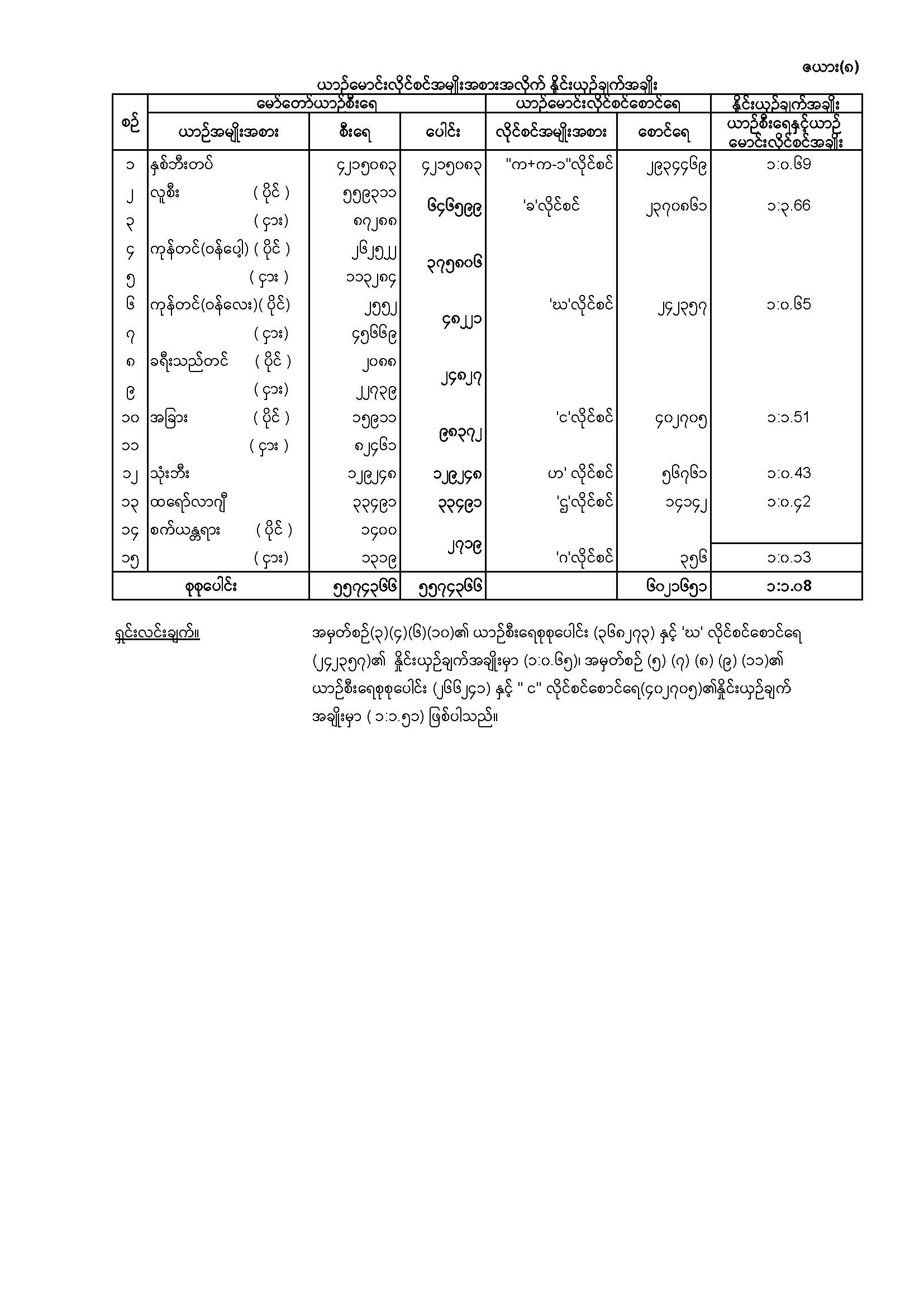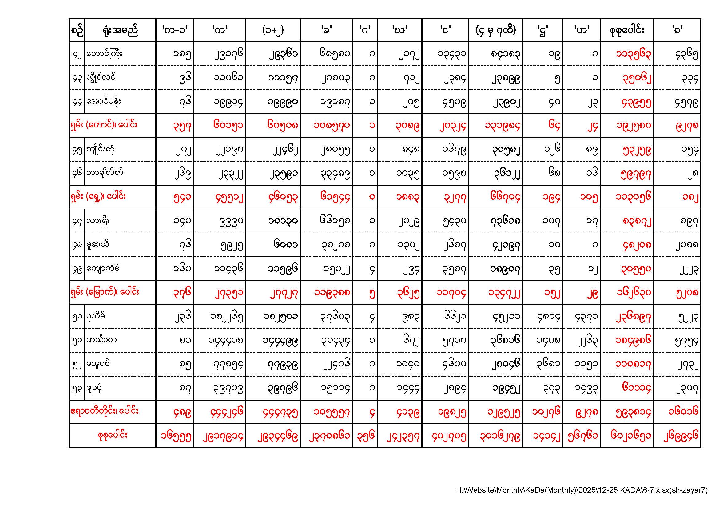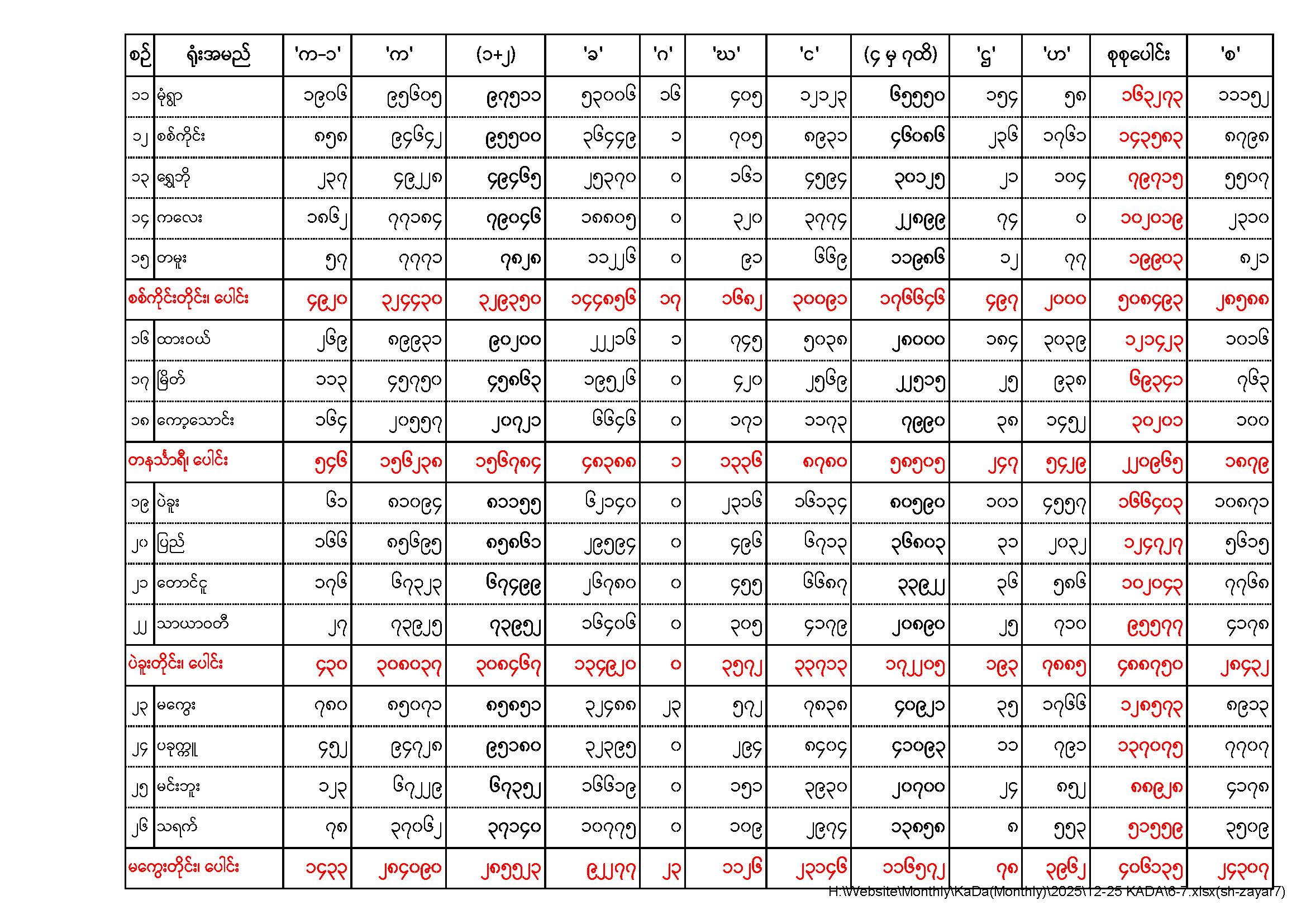 ၂၀၂၅ ခုနှစ်၊ ဒီဇင်ဘာလ အထိ (နေပြည်တော်/တိုင်းဒေသကြီး/ပြည်နယ်အလိုက် ယာဉ်မောင်းလိုင်စင်အမျိုးအစားအလိုက်အရှိစာရင်းစောင်ရေ)