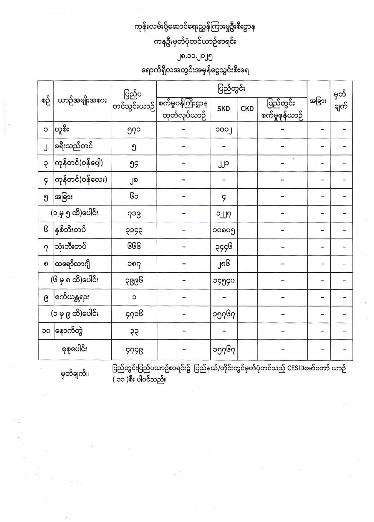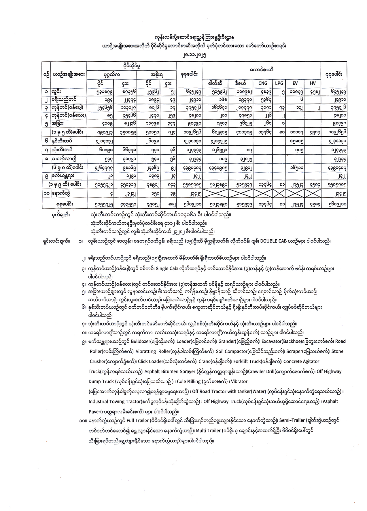 ၂၀၂၅ ခုနှစ်၊ နိုဝင်ဘာလထိ ပြည်နယ်တိုင်းခရိုင်ရုံးများတွင် အမျိုးအစားအလိုက် မှတ်ပုံတင်ထားသော မော်တော်ယာဉ်စာရင်း Published: 02 Dec, 2025 Place: ကုန်းလမ်းပို့ဆောင်ရေးညွှန်ကြားမှုဦးစီးဌာန