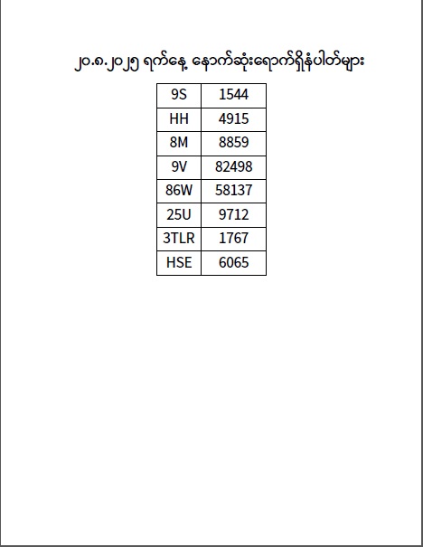 ၂၀.၈.၂၀၂၅ ရက်နေ့ထိ နောက်ဆုံးရောက်ရှိ နံပါတ်များ Published: 21 Aug, 2025 Place: ကုန်းလမ်းပို့ဆောင်ရေးညွှန်ကြားမှုဦးစီးဌာန