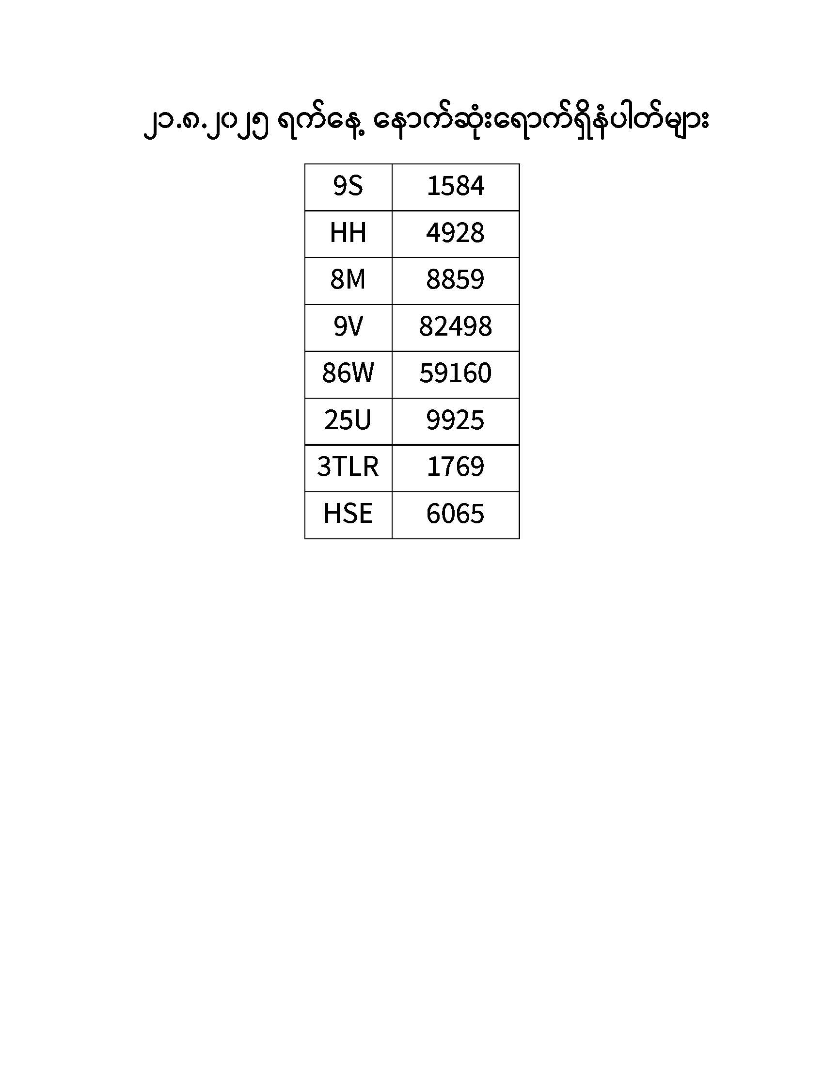 ၂၁.၈.၂၀၂၅ ရက်နေ့ထိ နောက်ဆုံးရောက်ရှိ နံပါတ်များ Published: 22 Aug, 2025 Place: ကုန်းလမ်းပို့ဆောင်ရေးညွှန်ကြားမှုဦးစီးဌာန