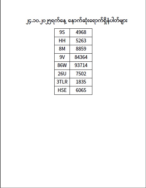 ၂၄.၁၀.၂၀၂၅ ရက်နေ့ထိ နောက်ဆုံးရောက်ရှိ နံပါတ်များ Published: 27 Oct, 2025 Place: ကုန်းလမ်းပို့ဆောင်ရေးညွှန်ကြားမှုဦးစီးဌာန