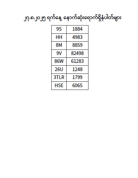 ၂၇.၈.၂၀၂၅ ရက်နေ့ထိ နောက်ဆုံးရောက်ရှိ နံပါတ်များ Published: 28 Aug, 2025 Place: ကုန်းလမ်းပို့ဆောင်ရေးညွှန်ကြားမှုဦးစီးဌာန