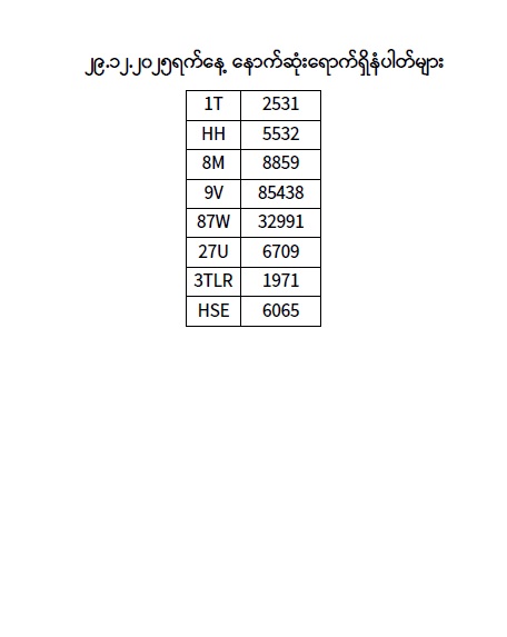၂၉.၁၂.၂၀၂၅ ရက်နေ့ထိ နောက်ဆုံးရောက်ရှိ နံပါတ်များ Published: 30 Dec, 2025 Place: ကုန်းလမ်းပို့ဆောင်ရေးညွှန်ကြားမှုဦးစီးဌာန