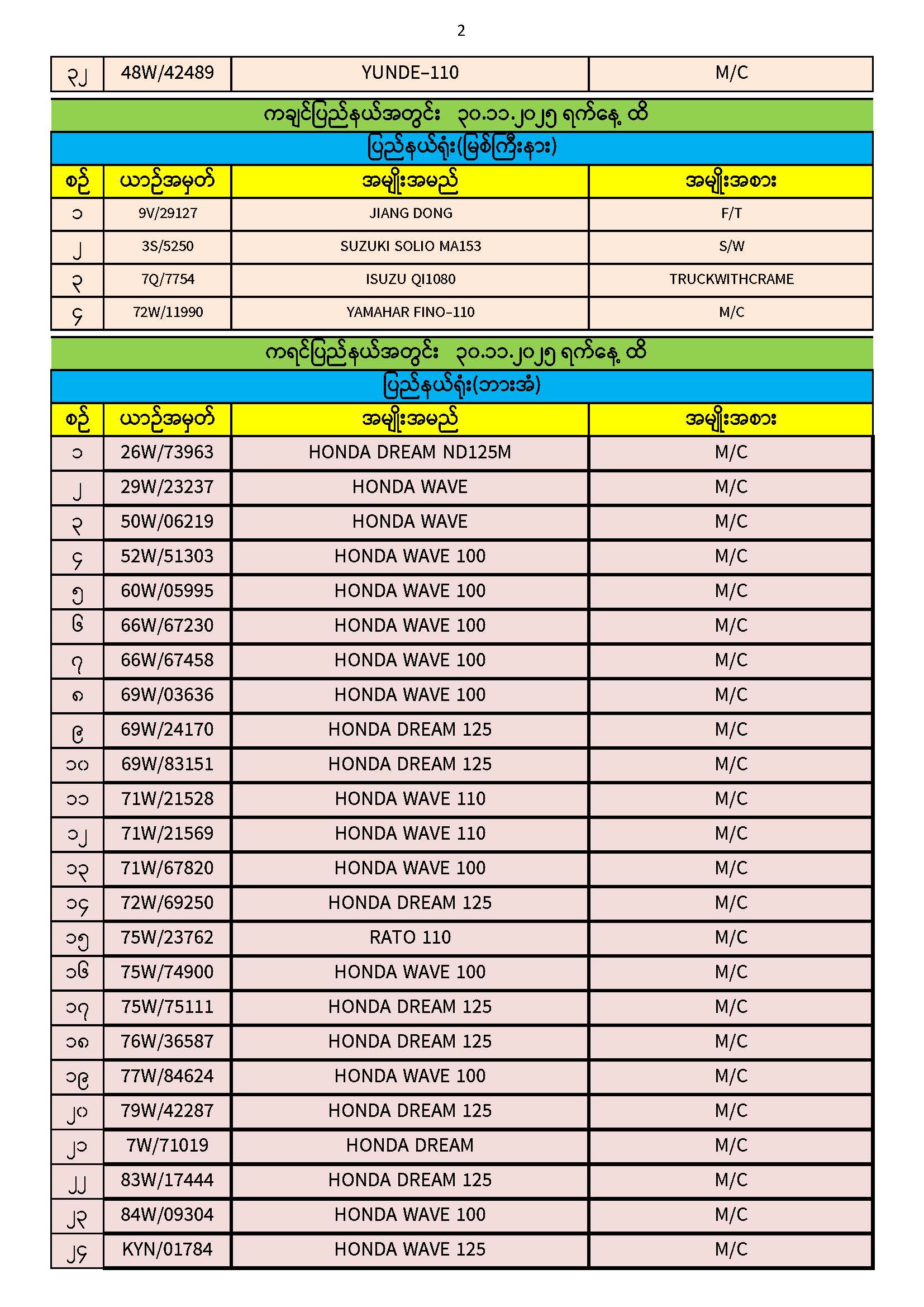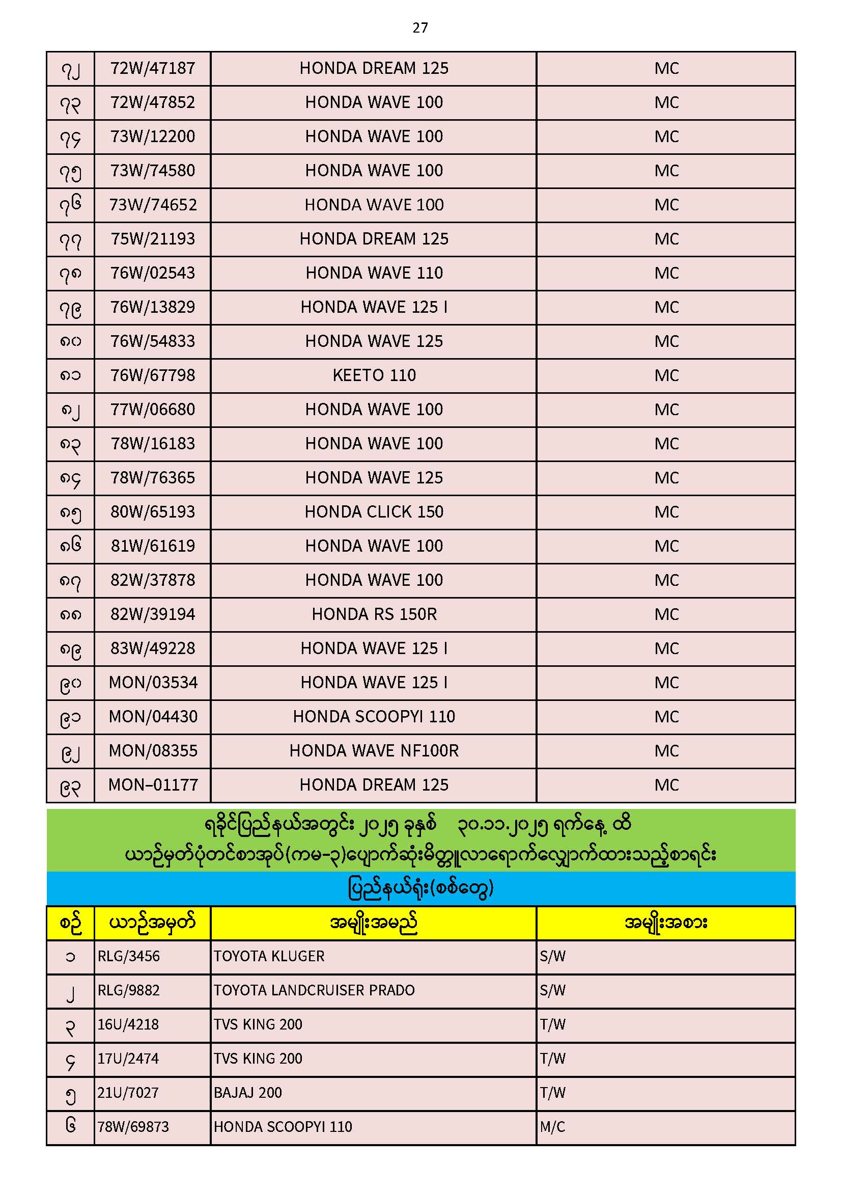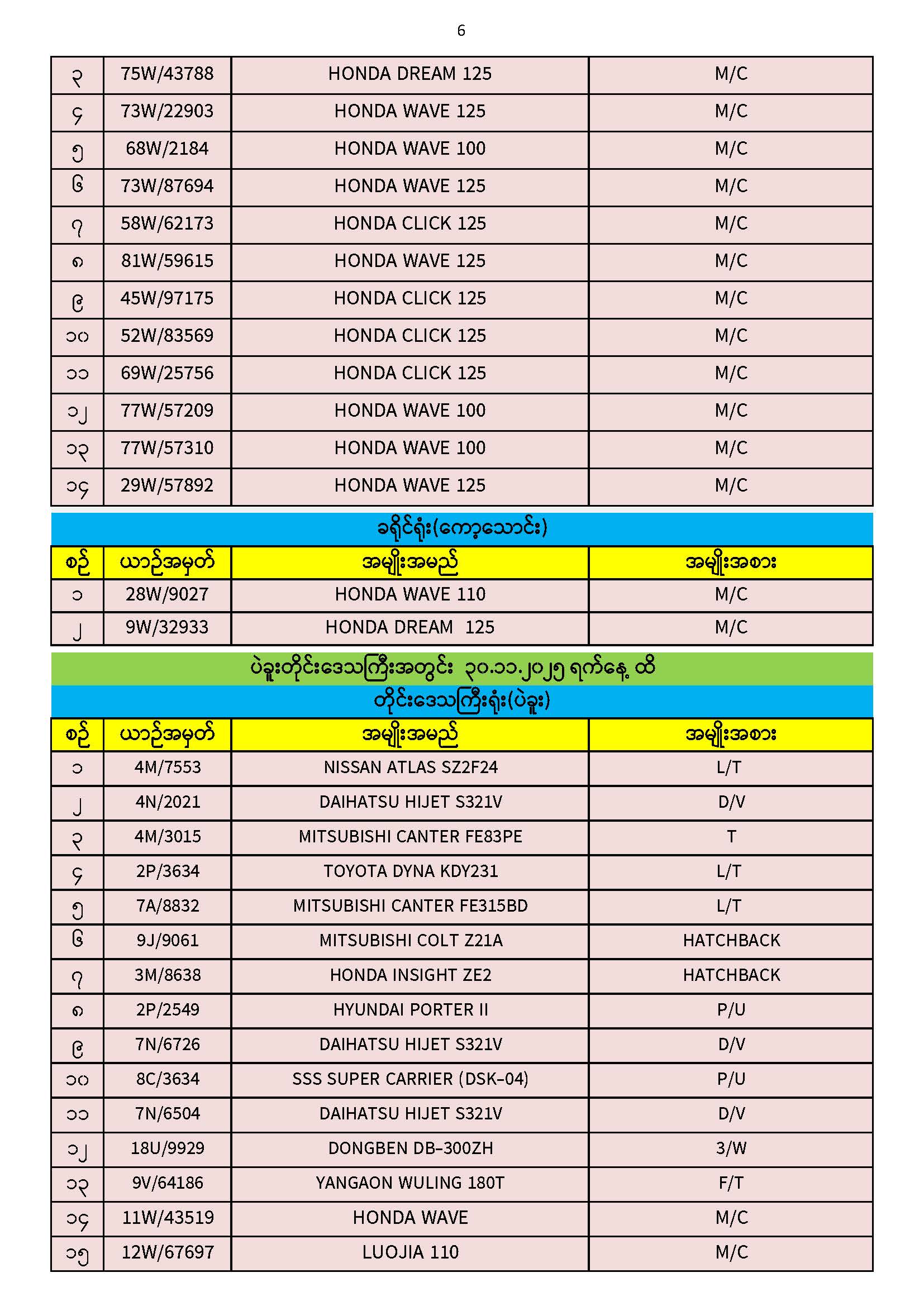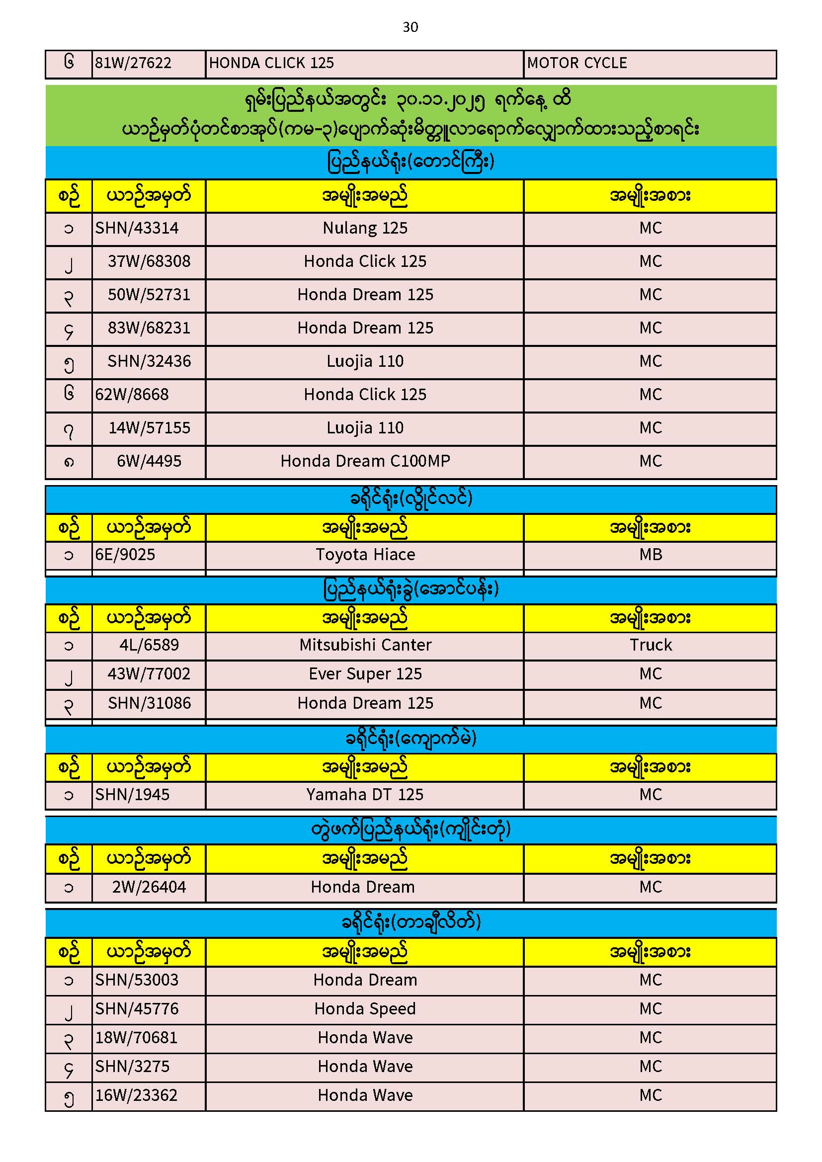၃၀.၁၁.၂၀၂၅ ရက်နေ့ထိ ယာဉ်မှတ်ပုံတင်စာအုပ်(ကမ-၃) ပျောက်ဆုံးမိတ္တူလာရောက် လျှောက်ထားသည့်စာရင်း Published: 04 Dec, 2025 Place: ကုန်းလမ်းပို့ဆောင်ရေးညွှန်ကြားမှုဦးစီးဌာန