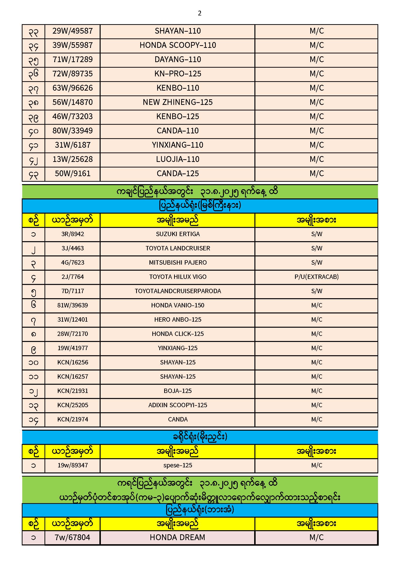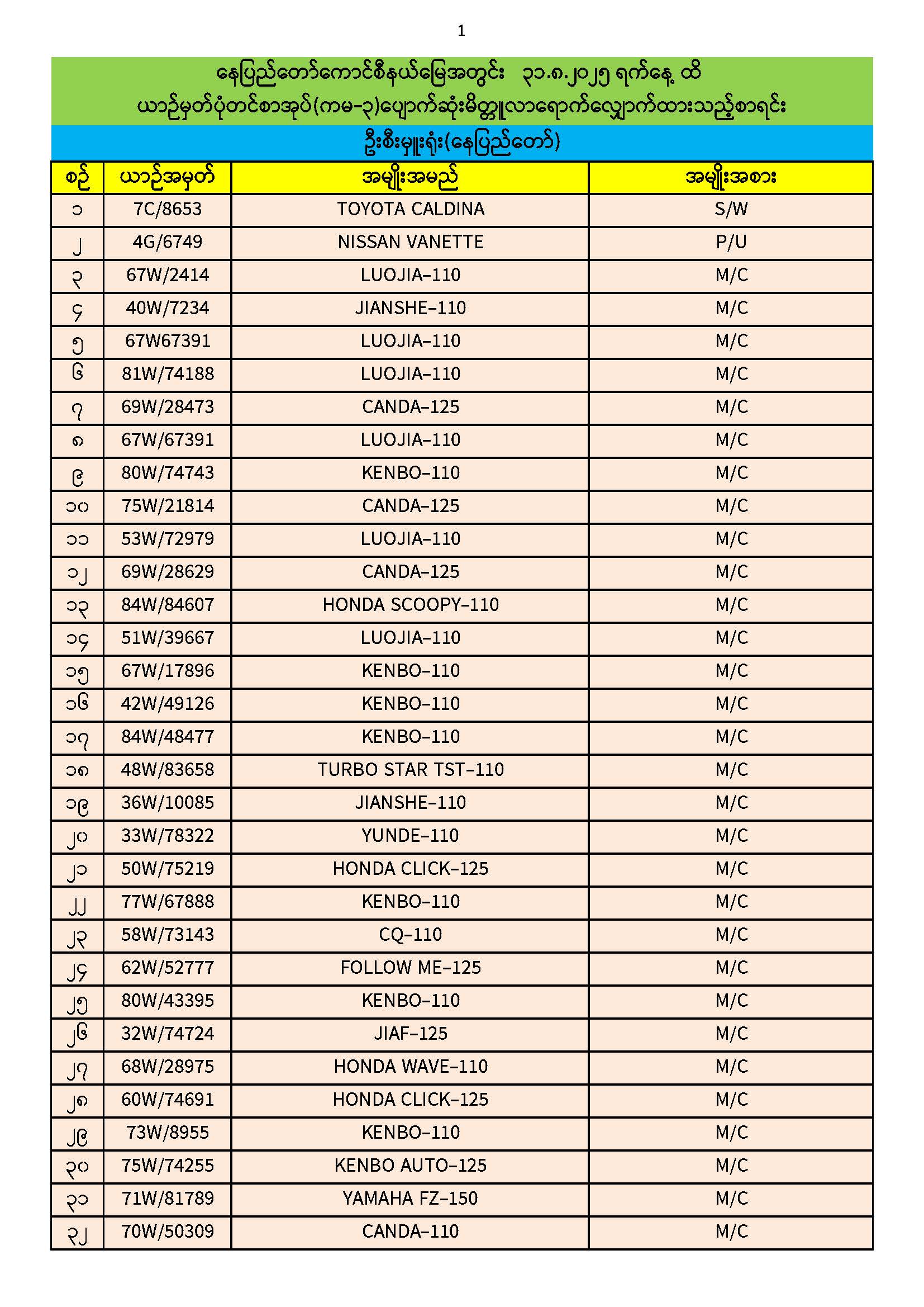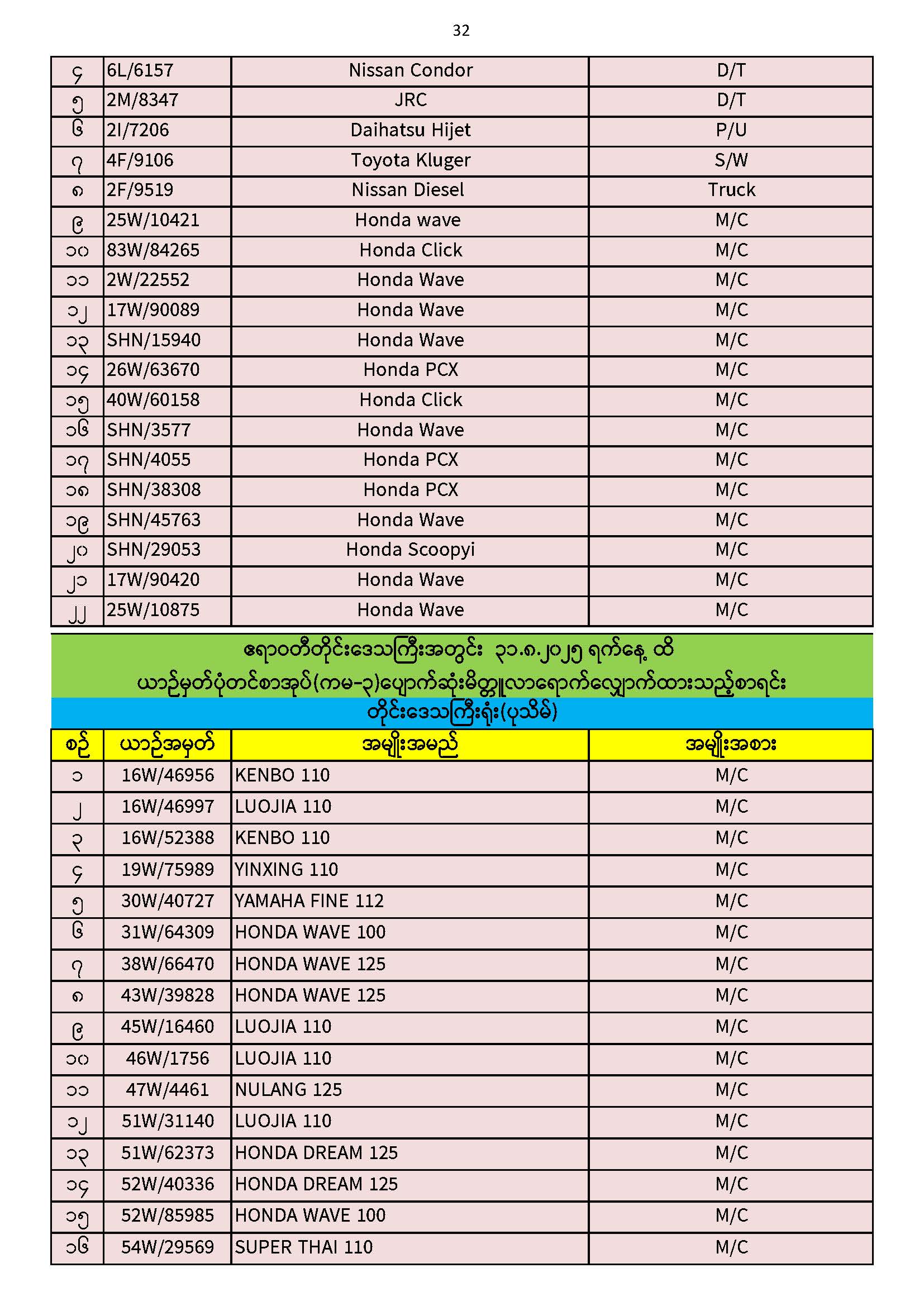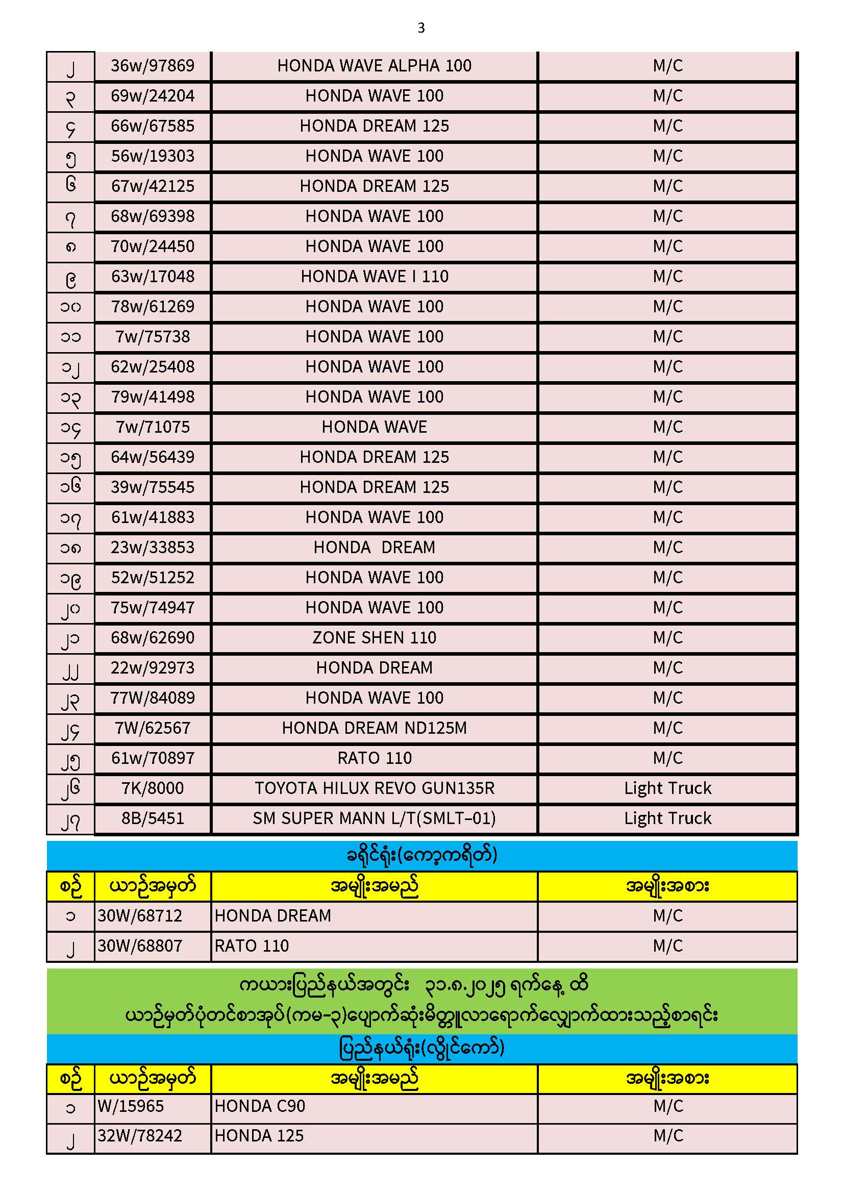 ၃၁.၈.၂၀၂၅ ရက်နေ့ထိ ယာဉ်မှတ်ပုံတင်စာအုပ်(ကမ-၃) ပျောက်ဆုံးမိတ္တူလာရောက် လျှောက်ထားသည့်စာရင်း Published: 04 Sep, 2025 Place: ကုန်းလမ်းပို့ဆောင်ရေးညွှန်ကြားမှုဦးစီးဌာန