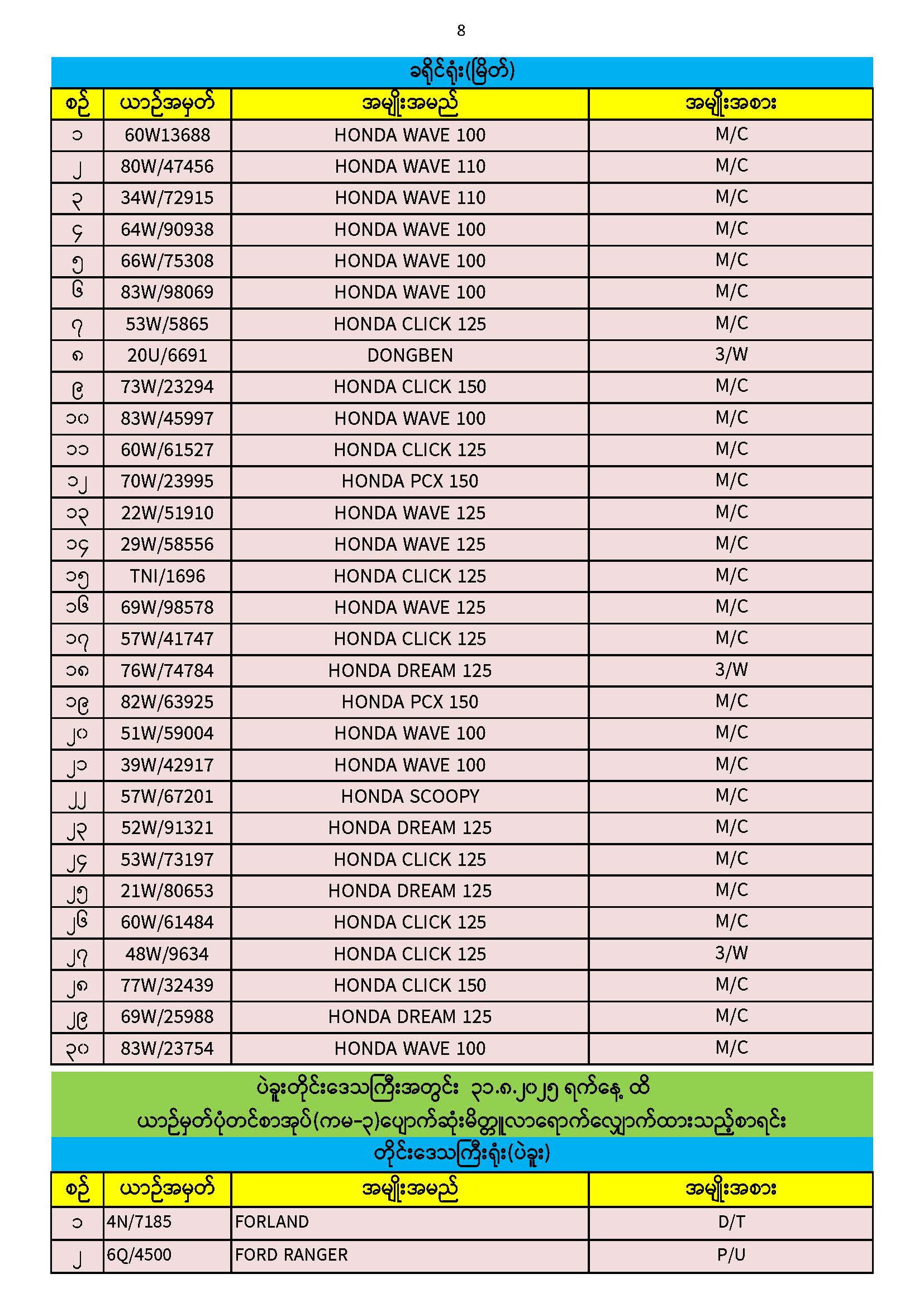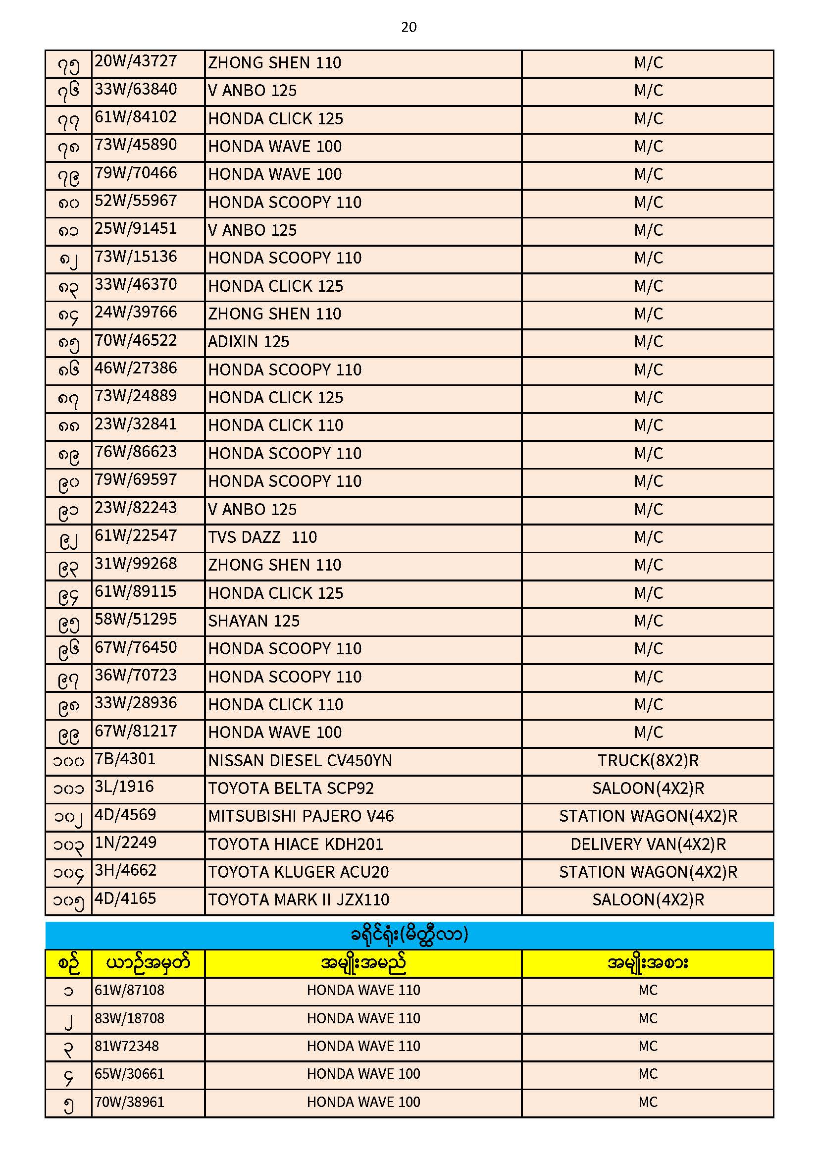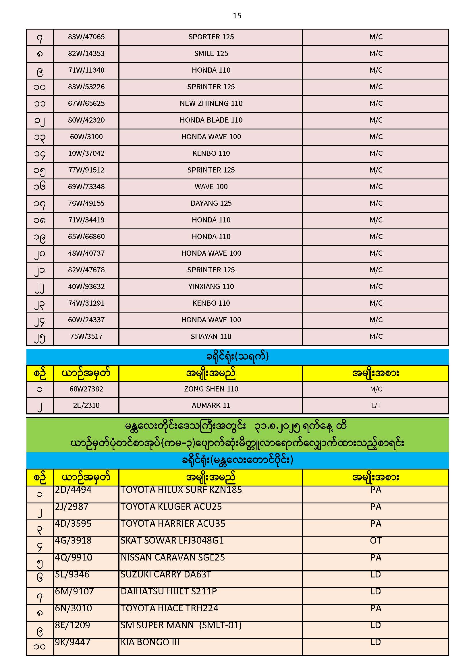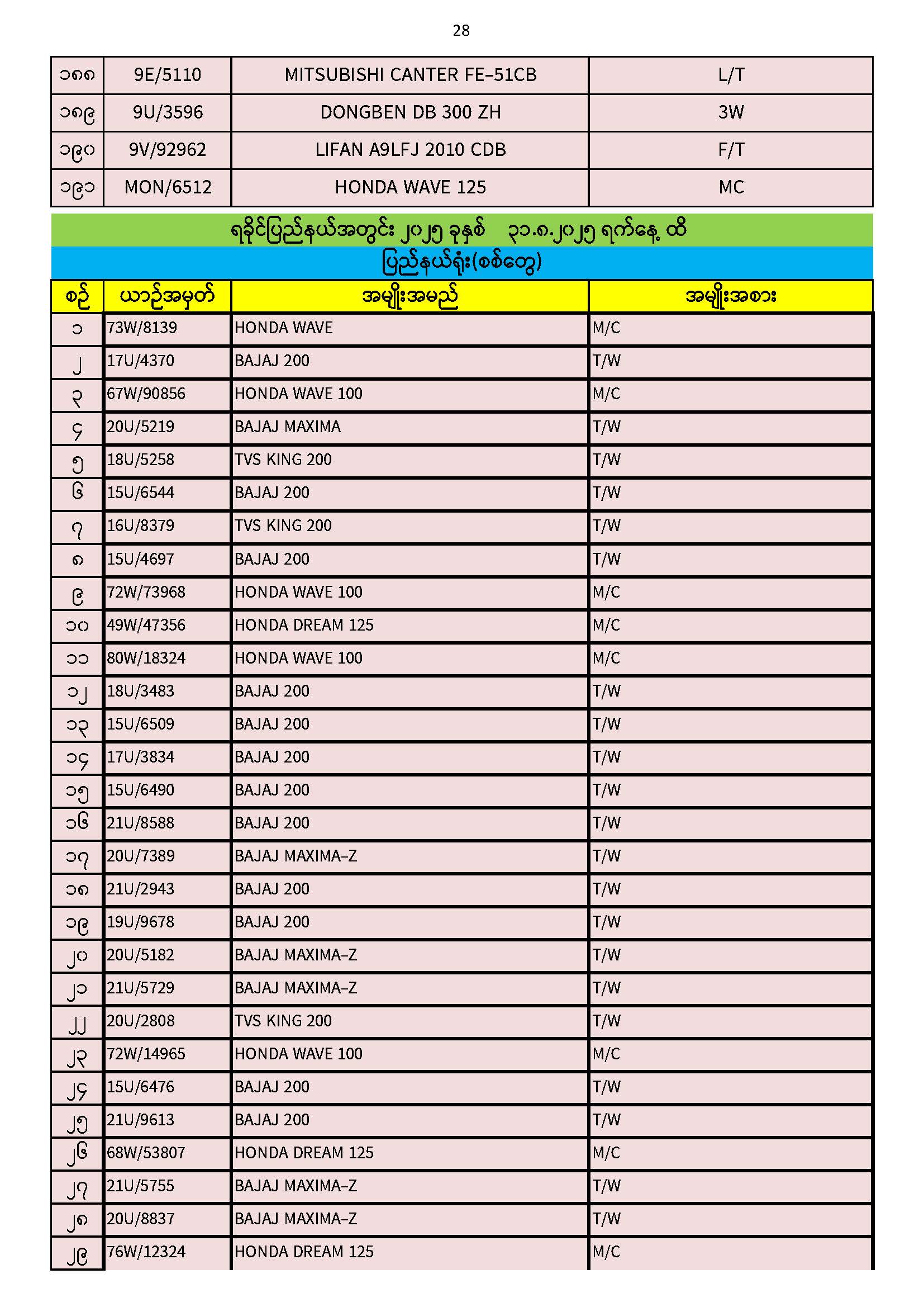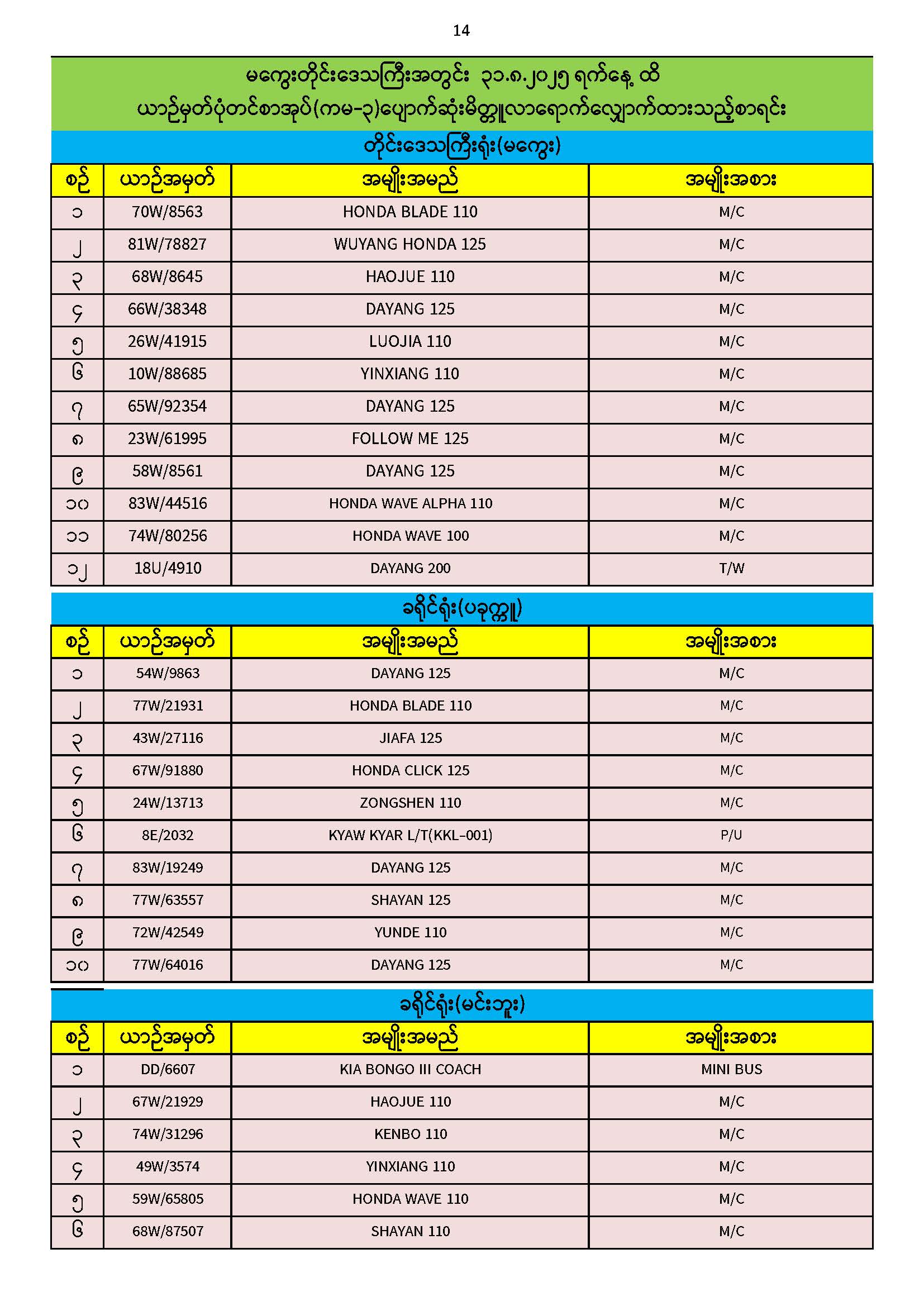 ၃၁.၈.၂၀၂၅ ရက်နေ့ထိ ယာဉ်မှတ်ပုံတင်စာအုပ်(ကမ-၃) ပျောက်ဆုံးမိတ္တူလာရောက် လျှောက်ထားသည့်စာရင်း Published: 04 Sep, 2025 Place: ကုန်းလမ်းပို့ဆောင်ရေးညွှန်ကြားမှုဦးစီးဌာန