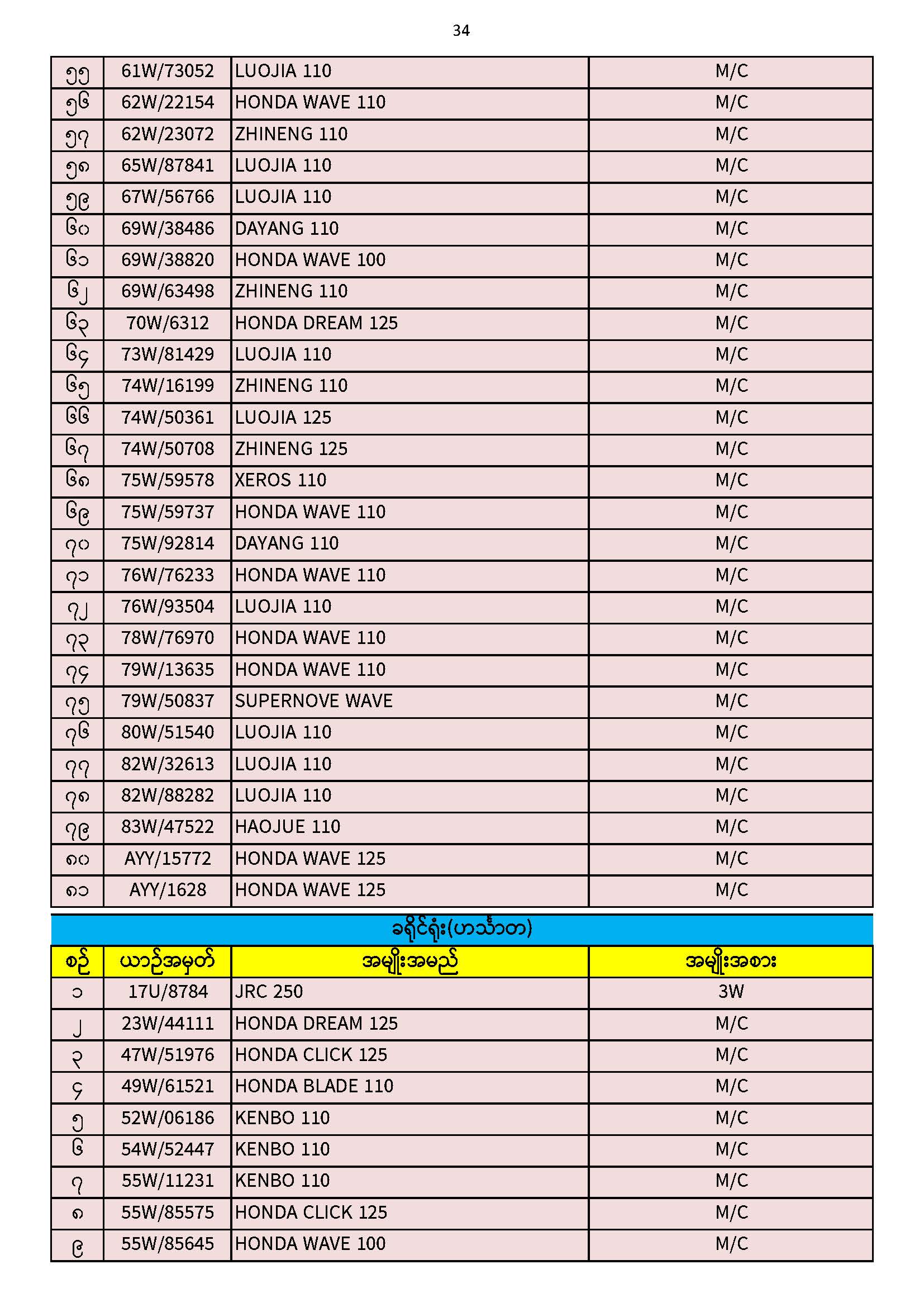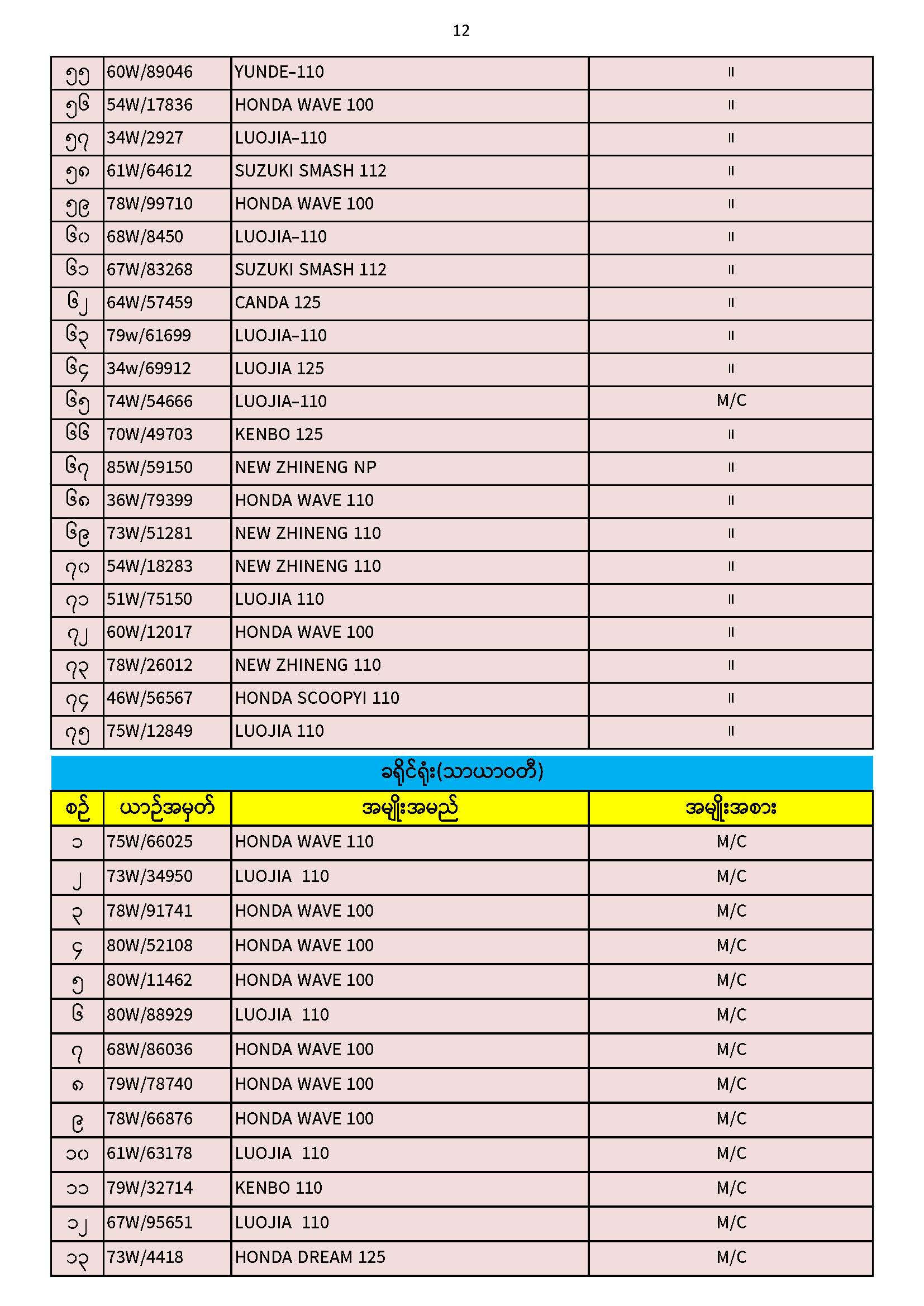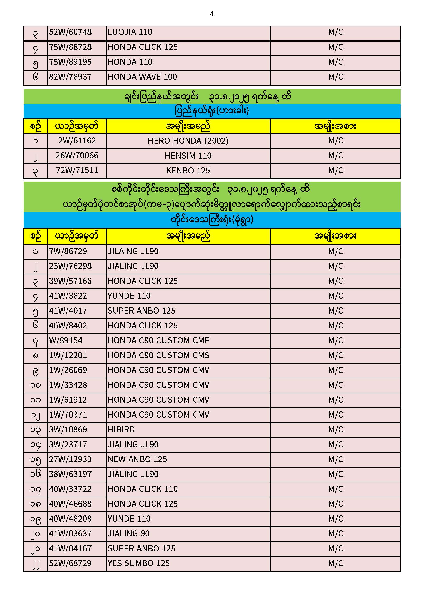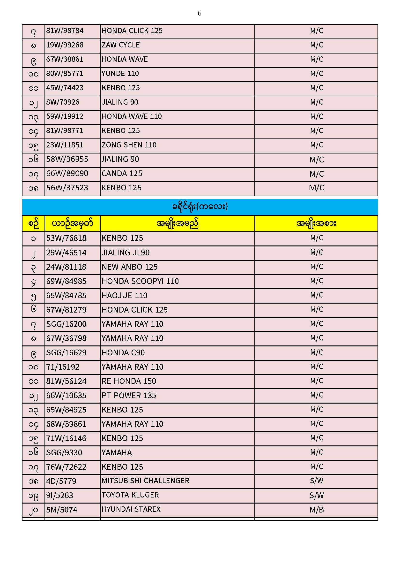 ၃၁.၈.၂၀၂၅ ရက်နေ့ထိ ယာဉ်မှတ်ပုံတင်စာအုပ်(ကမ-၃) ပျောက်ဆုံးမိတ္တူလာရောက် လျှောက်ထားသည့်စာရင်း Published: 04 Sep, 2025 Place: ကုန်းလမ်းပို့ဆောင်ရေးညွှန်ကြားမှုဦးစီးဌာန