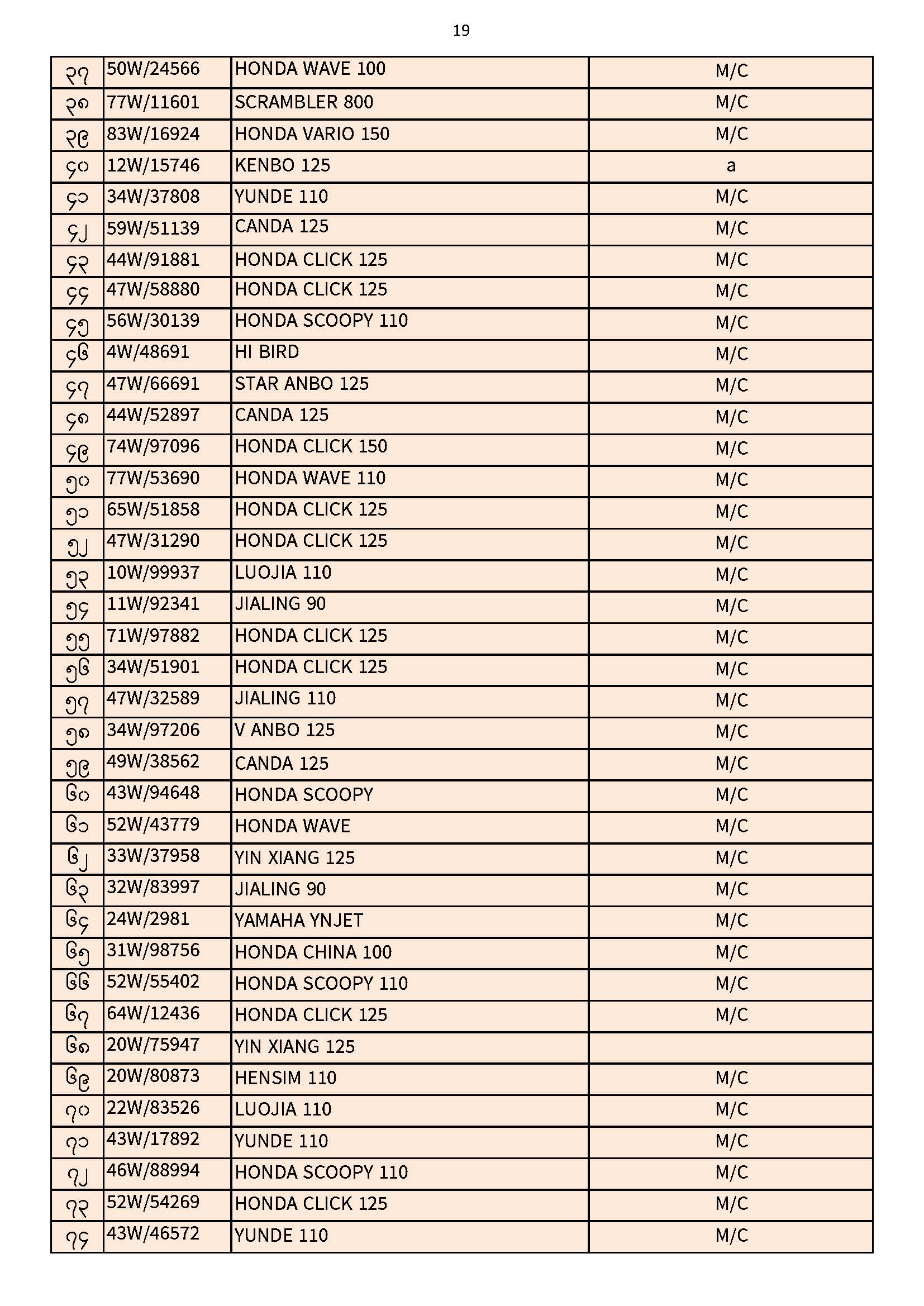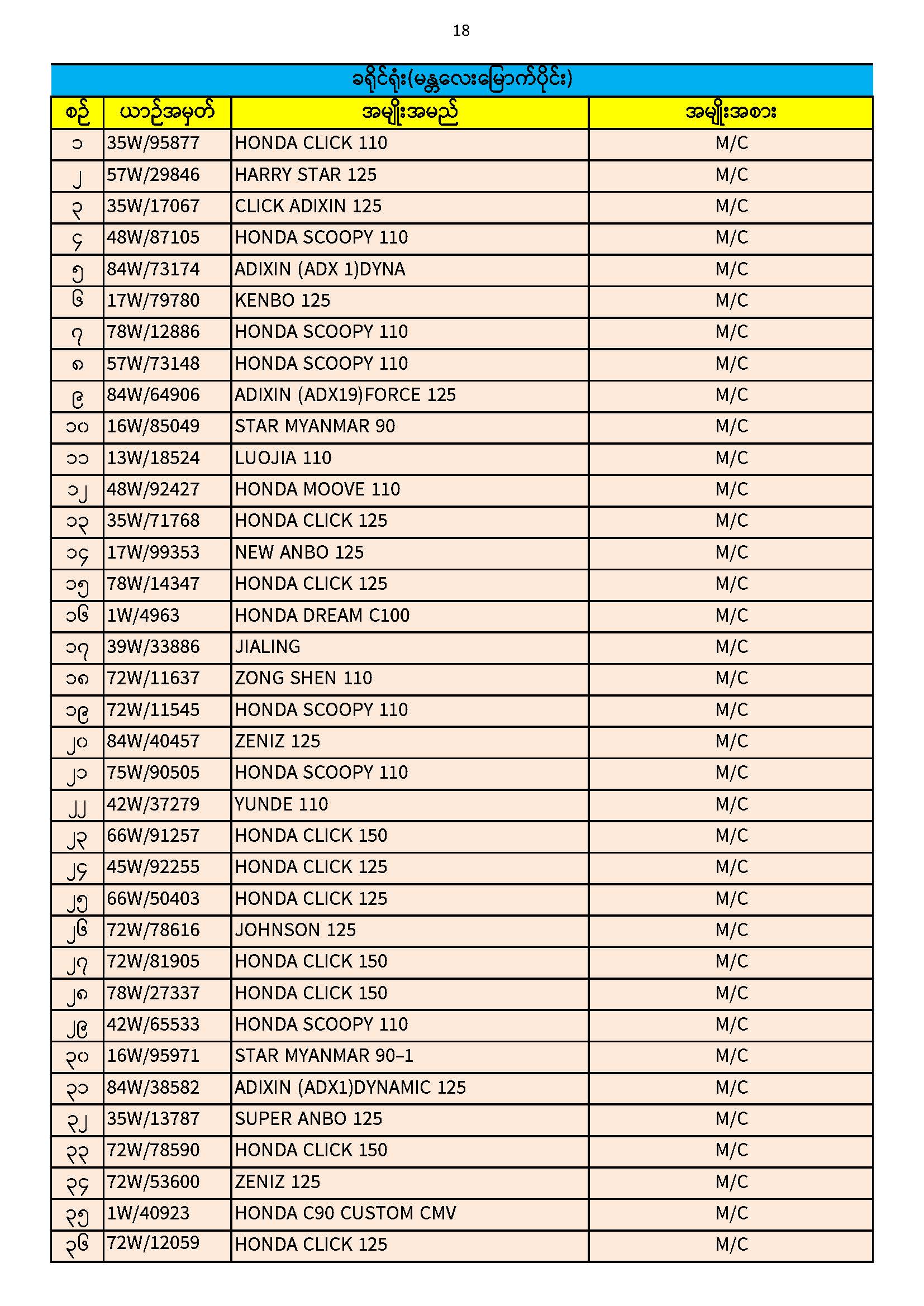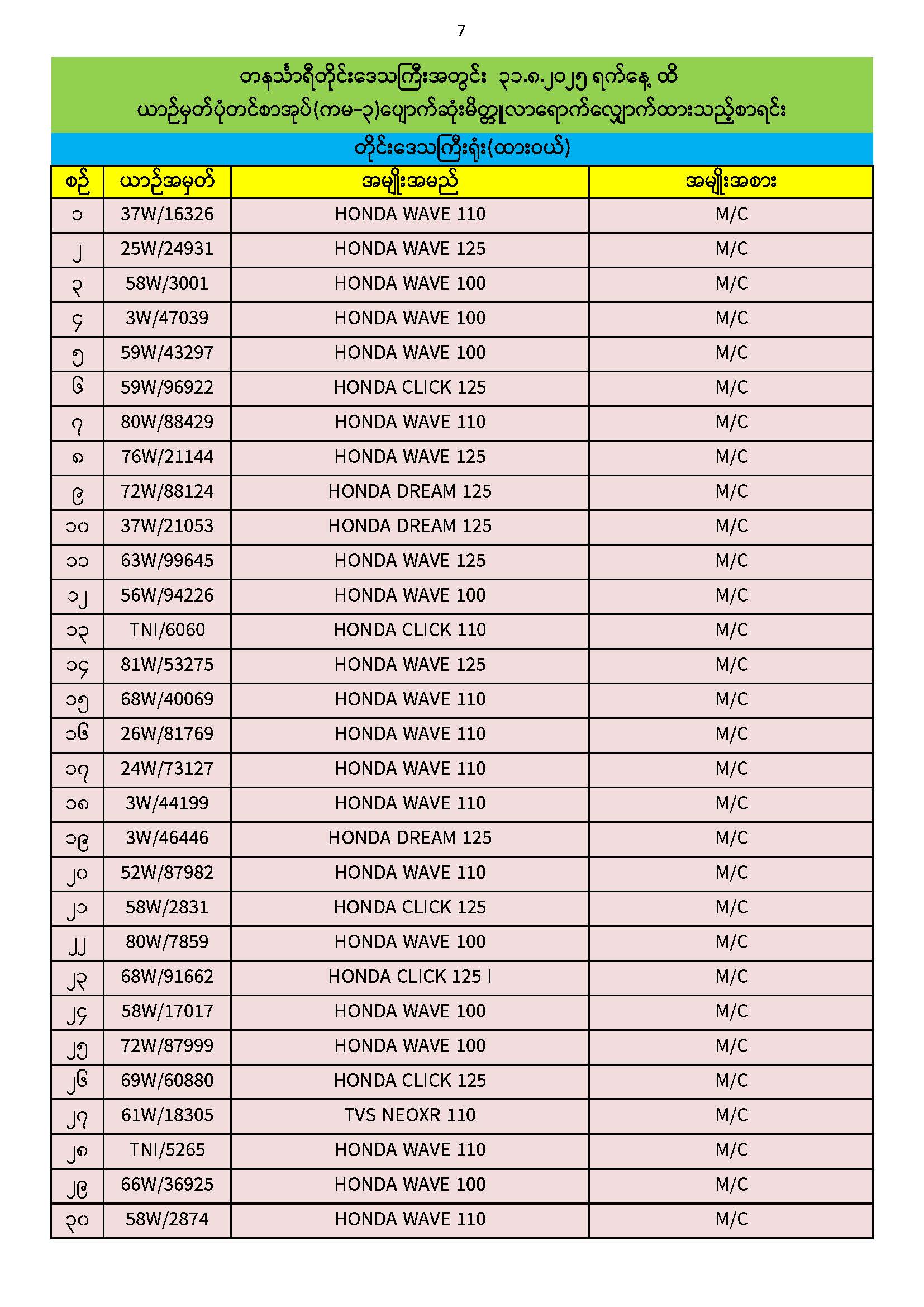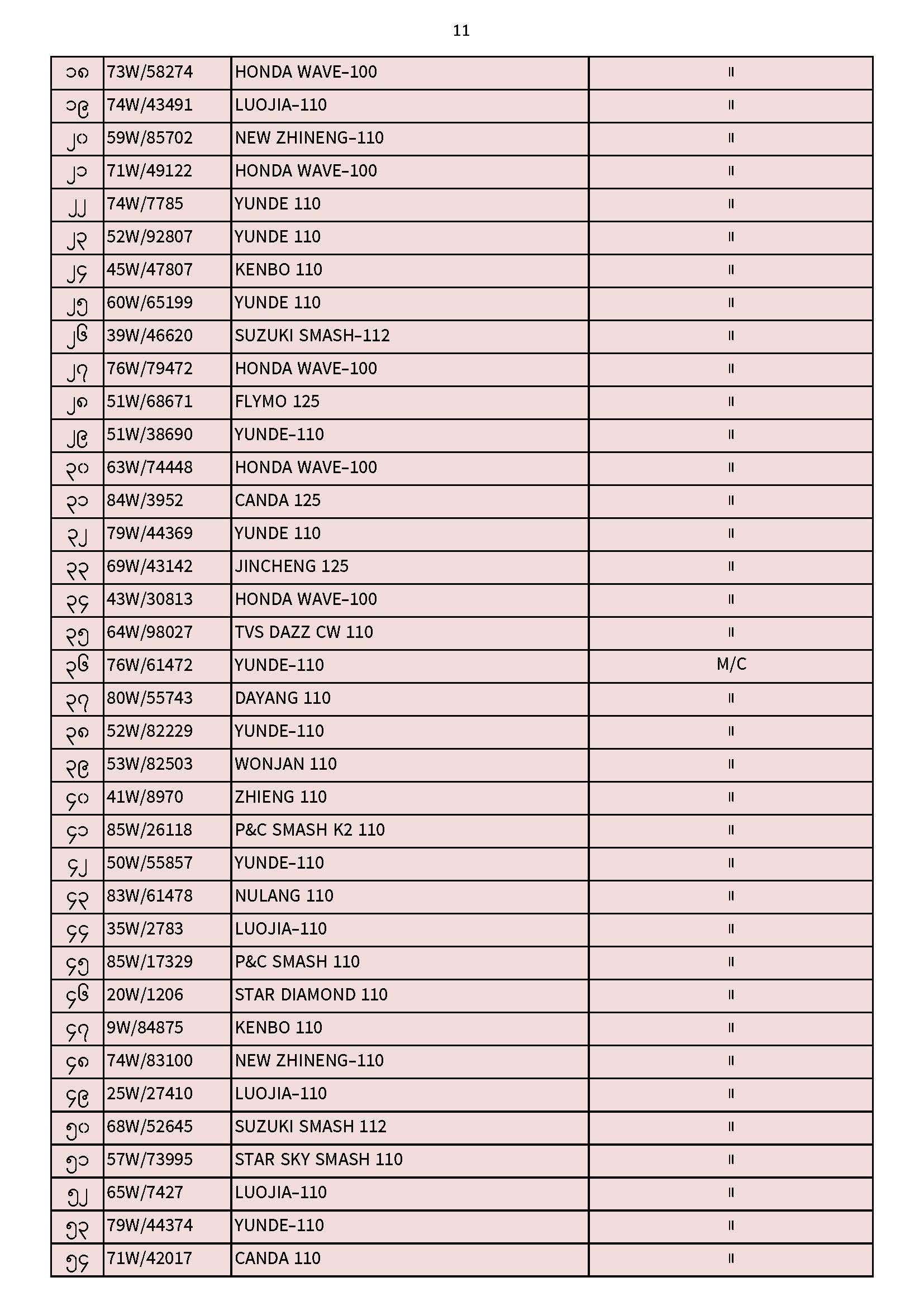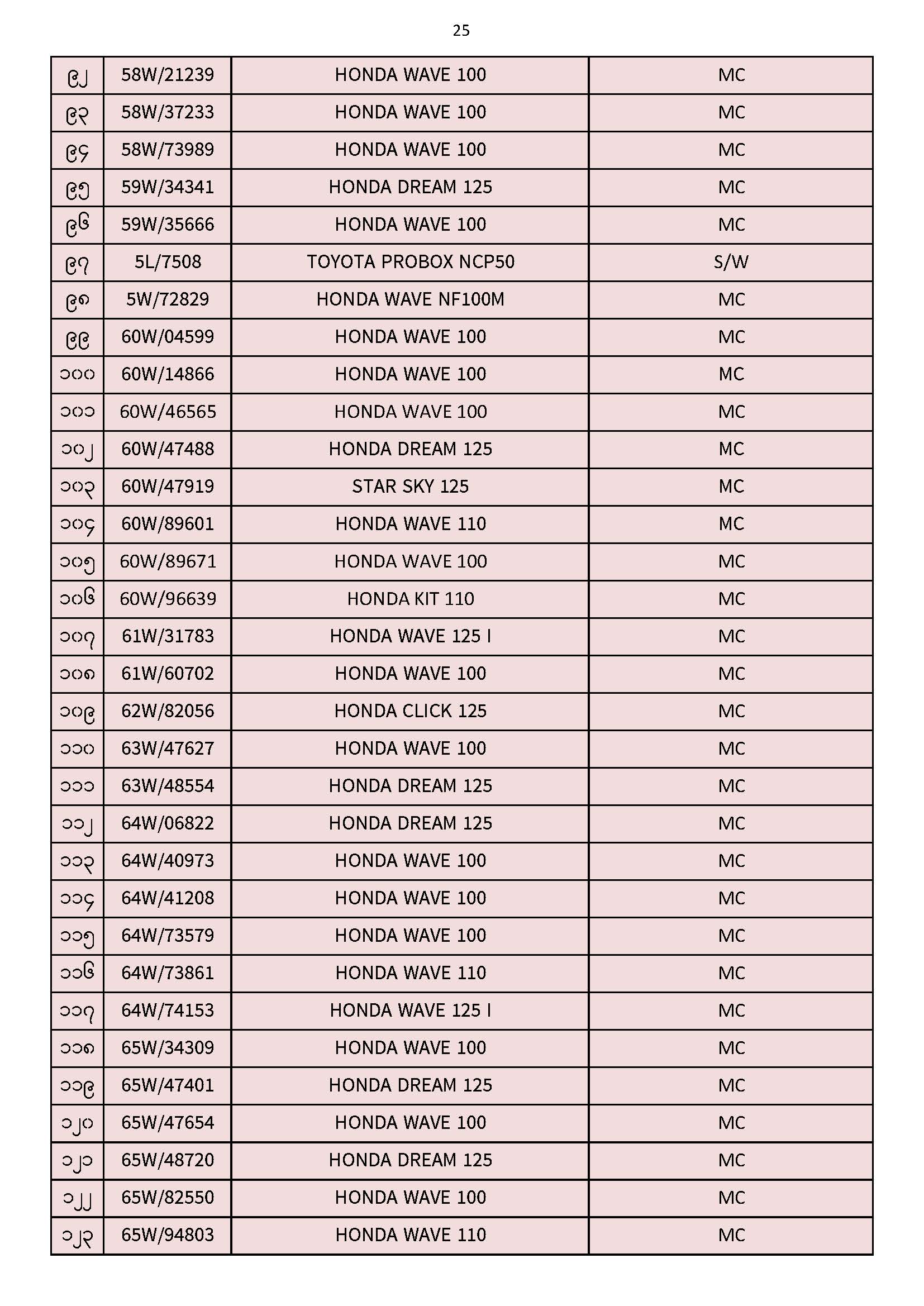 ၃၁.၈.၂၀၂၅ ရက်နေ့ထိ ယာဉ်မှတ်ပုံတင်စာအုပ်(ကမ-၃) ပျောက်ဆုံးမိတ္တူလာရောက် လျှောက်ထားသည့်စာရင်း Published: 04 Sep, 2025 Place: ကုန်းလမ်းပို့ဆောင်ရေးညွှန်ကြားမှုဦးစီးဌာန