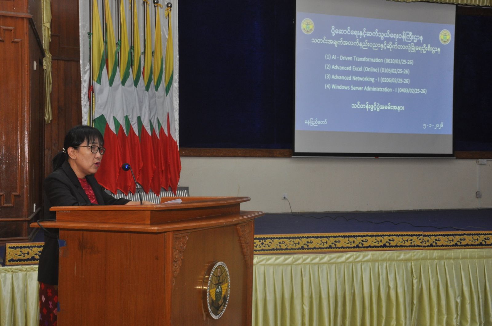 ရှေးဦးစွာ ပို့ဆောင်ရေးနှင့်ဆက်သွယ်ရေးဝန်ကြီးဌာန၊ သတင်းအချက်အလက်နည်းပညာ နှင့်ဆိုက်ဘာလုံခြုံရေးဦးစီးဌာန၊ သတင်းအချက်အလက်နည်းပညာဌာန၊ ဒုတိယညွှန်ကြားရေးမှူးချုပ်က Artificial Intelligence (AI) နည်းပညာ သည် နယ်ပယ်အသီးသီးတွင် အရေးပါလာကြောင်း၊ ဖွံ့ဖြိုးပြီးနိုင်ငံများအနေဖြင့် AI နည်းပညာကို စီးပွားရေး၊ လူမှုဘဝနှင့် နည်းပညာဖွံ့ဖြိုးမှုအတွက် အကောင်အထည်ဖော်နေပြီး AI အသုံးချမှုများတွင် အောင်မြင်မှုများကိုလည်း တွေ့ရှိနေရပြီဖြစ်ကြောင်းနှင့် အစိုးရလုပ်ငန်း ဆောင်တာများတွင် AI နည်းပညာပေါင်းစည်းနိုင်မည့် အခြေအနေများ၊ ပိုမိုကောင်းမွန်သော ဝန်ဆောင်မှုများ ပေးစွမ်းနိုင်ရန် AI-Driven Transformation သင်တန်းအား ဖွင့်လှစ်ပေးခြင်း ဖြစ်ကြောင်း ပြောကြားခဲ့သည်။