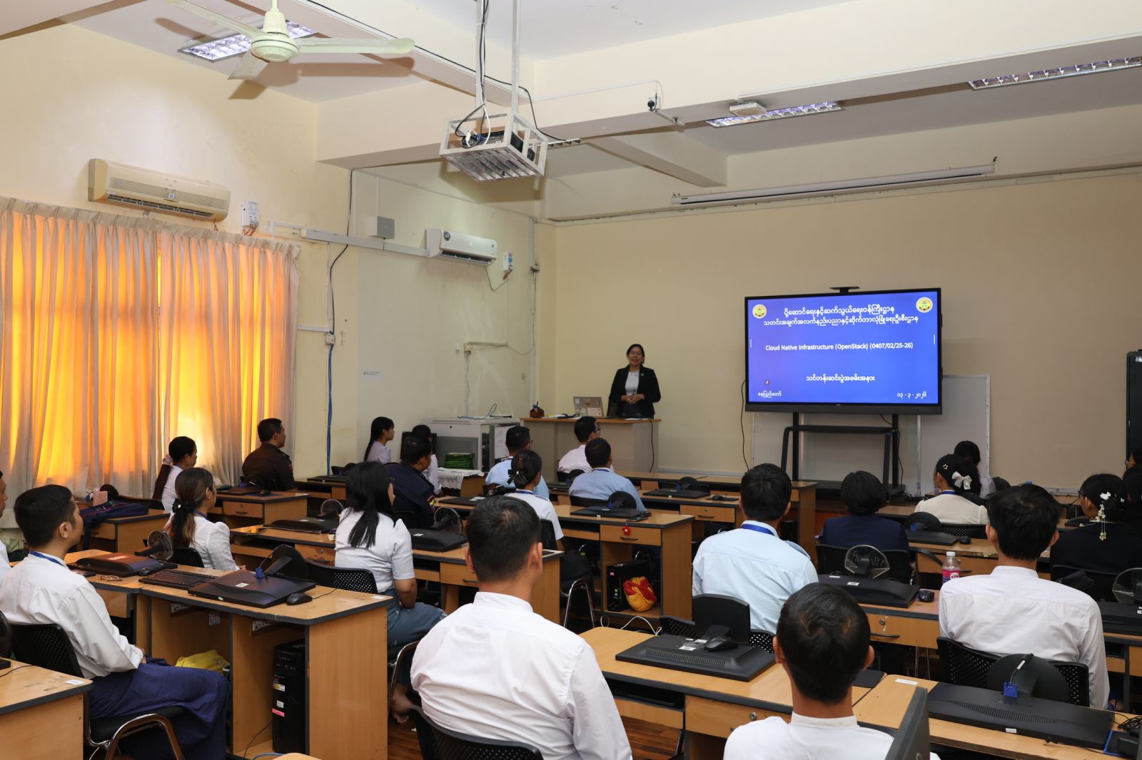 Cloud Native Infrastructure (Open Stack) သင်တန်းသည် OpenStack နှင့် Cloud Native Architecture ကို အခြေခံ၍ Virtualization၊ Containerization နှင့် Orchestration နည်းပညာများကို Physical Devices များဖြင့် ၃ပတ်ကြာ သင်ကြားပို့ချပေးခဲ့ကြောင်း သိရှိရပါသည်။