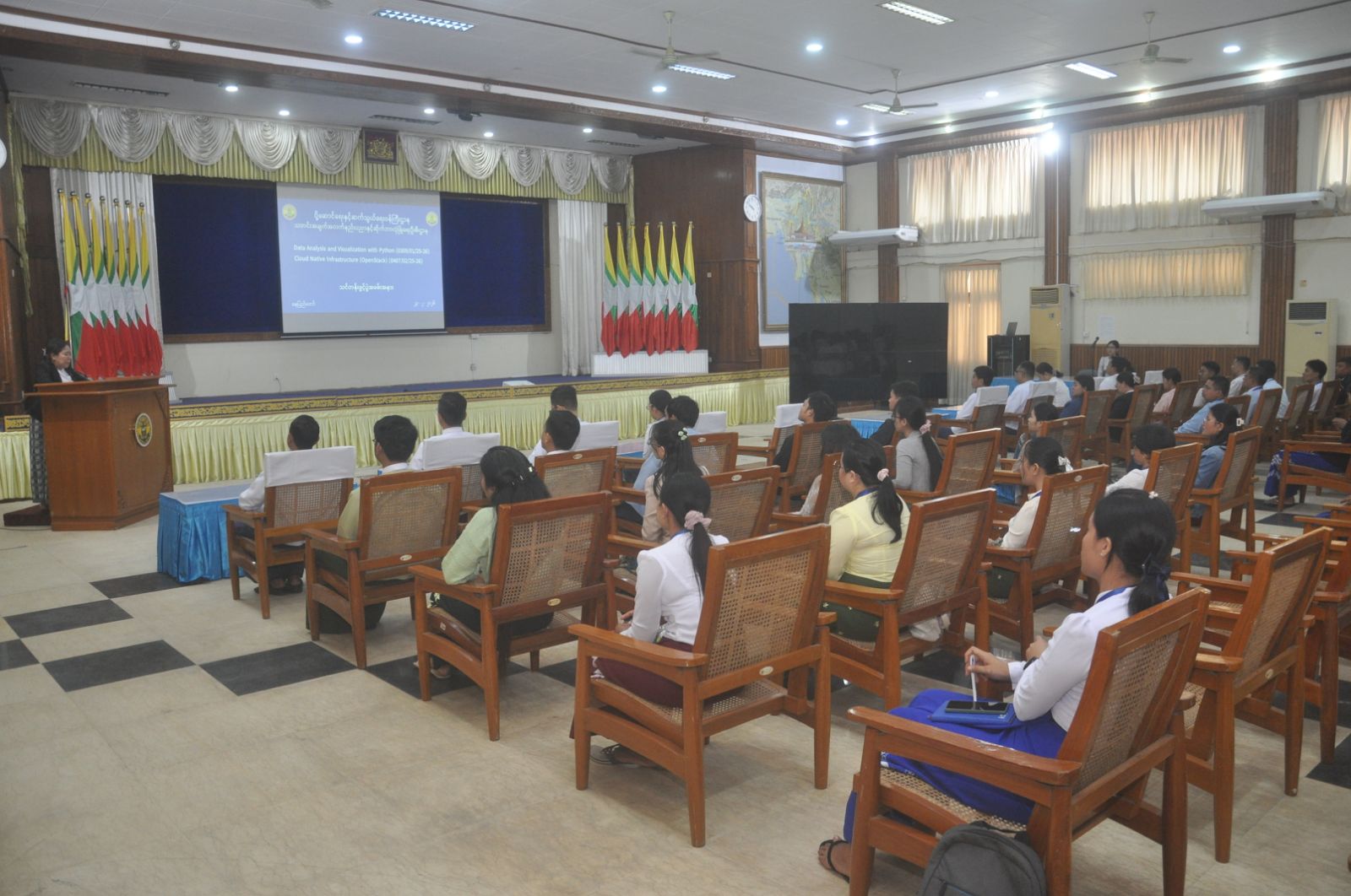 ပို့ဆောင်ရေးနှင့်ဆက်သွယ်ရေးဝန်ကြီးဌာန၊ သတင်းအချက်အလက်နည်းပညာနှင့် ဆိုက်ဘာ လုံခြုံရေးဦးစီးဌာန၊ သတင်းအချက်အလက်နည်းပညာနှင့် ဆိုက်ဘာလုံခြုံရေး သင်တန်းကျောင်း ၏ ၂၀၂၅-၂၆ လေ့ကျင့်သင်ကြားရေးနှစ်အတွင်း Data Analysis and Visualization with Python သင်တန်းနှင့် Cloud Native Infrastructure (Open Stack) သင်တန်းများ၏ သင်တန်းဖွင့်ပွဲအခမ်းအနားကို ၂၀၂၆ ခုနှစ် ဖေဖော်ဝါရီလ ၂၃ ရက်နေ့ နံနက်ပိုင်းတွင် ရုံးအမှတ် (၂)၊ စုပေါင်းခန်းမတွင် ကျင်းပပြုလုပ်ခဲ့ရာ ပို့ဆောင်ရေးနှင့် ဆက်သွယ်ရေးဝန်ကြီးဌာန၊ သတင်းအချက်အလက်နည်းပညာနှင့် ဆိုက်ဘာလုံခြုံရေးဦးစီးဌာန၊ သင်တန်းကျောင်း ကျောင်းအုပ် ဒေါ်နှင်းခိုင်အေးနှင့် တကွ ဌာနအကြီးအကဲများ၊ ပြည်ထောင်စုအဆင့် အဖွဲ့အစည်းများနှင့် ပြည်ထောင်စုဝန်ကြီးဌာန အသီးသီးမှ သင်တန်းသား/သင်တန်းသူများ စုစုပေါင်း ၄၅ ဦး တက်ရောက်ခဲ့ကြောင်း သိရှိရပါသည်။