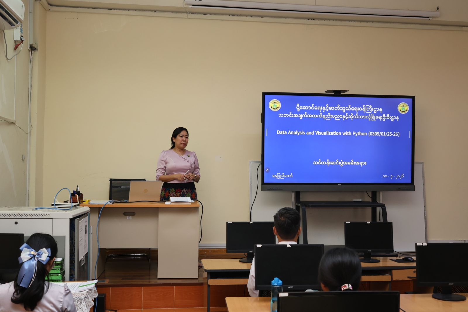 ပို့ဆောင်ရေးနှင့်ဆက်သွယ်ရေးဝန်ကြီးဌာန၊ သတင်းအချက်အလက်နည်းပညာနှင့်ဆိုက်ဘာလုံခြုံရေးဦးစီးဌာန၊ သတင်းအချက်အလက်နည်းပညာနှင့်ဆိုက်ဘာလုံခြုံရေးသင်တန်းကျောင်း၏ ၂၀၂၅-၂၆ လေ့ကျင့်သင်ကြားရေးနှစ်အတွင်း Data Analysis and Visualization with Python သင်တန်း၏ သင်တန်းဆင်းပွဲအခမ်းအနားကို ၂၀၂၆ ခုနှစ် မတ်လ ၁၀ ရက်နေ့ နေ့လည်ပိုင်းတွင်      e-Learning Center II တွင် ကျင်းပပြုလုပ်ခဲ့ရာ ပို့ဆောင်ရေးနှင့်ဆက်သွယ်ရေးဝန်ကြီးဌာန၊ သတင်းအချက်အလက်နည်းပညာနှင့်ဆိုက်ဘာလုံခြုံရေးဦးစီးဌာန၊ သတင်းအချက်အလက်နည်းပညာနှင့်ဆိုက်ဘာလုံခြုံရေးသင်တန်းကျောင်း ကျောင်းအုပ် ဒေါ်နှင်းခိုင်အေးနှင့်တကွ ဌာနအကြီးအကဲများ၊ ပြည်ထောင်စုအဆင့်အဖွဲ့အစည်းများနှင့် ပြည်ထောင်စုဝန်ကြီးဌာန အသီးသီးမှ သင်တန်းသား/သင်တန်းသူများ စုစုပေါင်း ၂၂ ဦး တက်ရောက်ခဲ့ကြောင်း သိရှိ ရပါသည်။