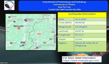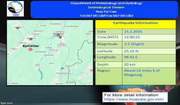 မြေငလျင်သတင်း၂၀၂၆ ခုနှစ် ၊ ဖေဖော်ဝါရီလ ၊ ( ၂၅ ) ရက်