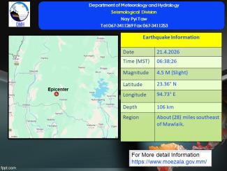 မြေငလျင်သတင်း၂၀၂၆ ခုနှစ် ၊ ဧပြီလ ၊ ( ၂၁ ) ရက်