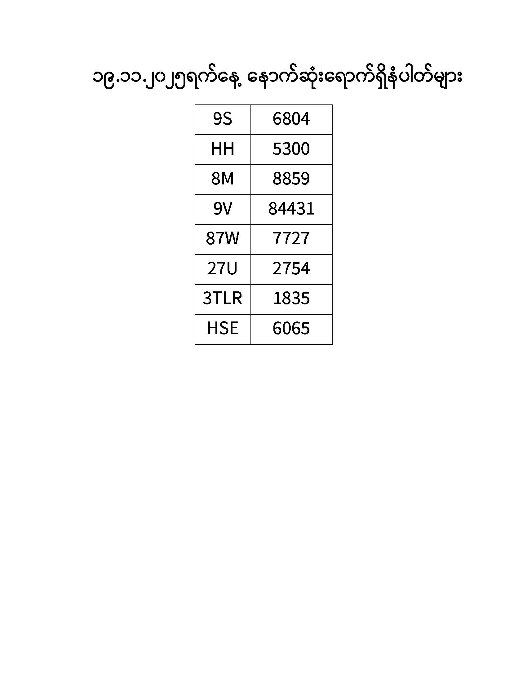 ၁၉.၁၁.၂၀၂၅ ရက်နေ့ထိ နောက်ဆုံးရောက်ရှိ နံပါတ်များ Published: 20 Nov, 2025 Place: ကုန်းလမ်းပို့ဆောင်ရေးညွှန်ကြားမှုဦးစီးဌာန
