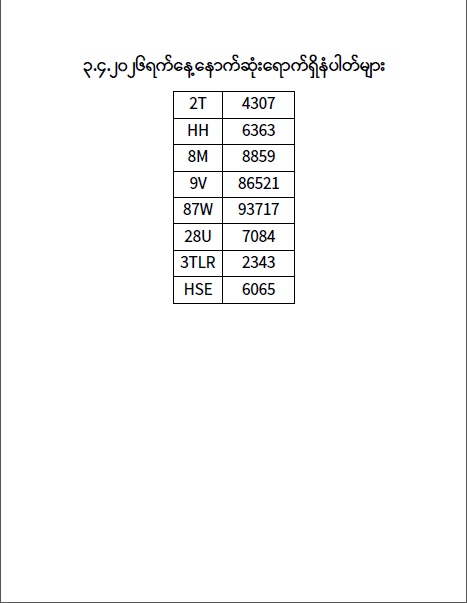 ၃.၄.၂၀၂၆ ရက်နေ့ထိ နောက်ဆုံးရောက်ရှိ နံပါတ်များ Published: 06 Apr, 2026 Place: ကုန်းလမ်းပို့ဆောင်ရေးညွှန်ကြားမှုဦးစီးဌာန