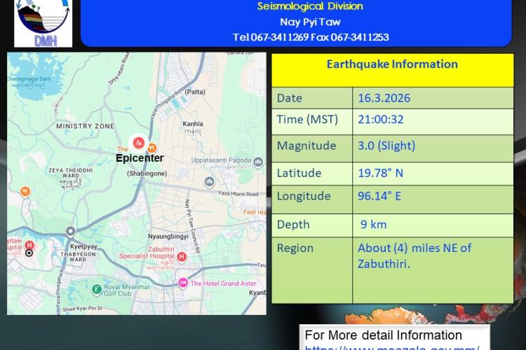 နောက်ဆက်တွဲမြေငလျင်သတင်းအမှတ်စဉ် -၂၈၇မိုးလေဝသနှင့်ဇလဗေဒညွှန်ကြားမှုဦးစီးဌာန