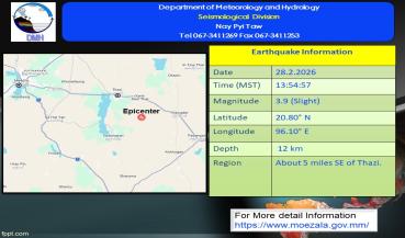 မြေငလျင်သတင်း၂၀၂၆ ခုနှစ် ၊ ဖေဖော်ဝါရီလ ၊ ( ၂၈ ) ရက်