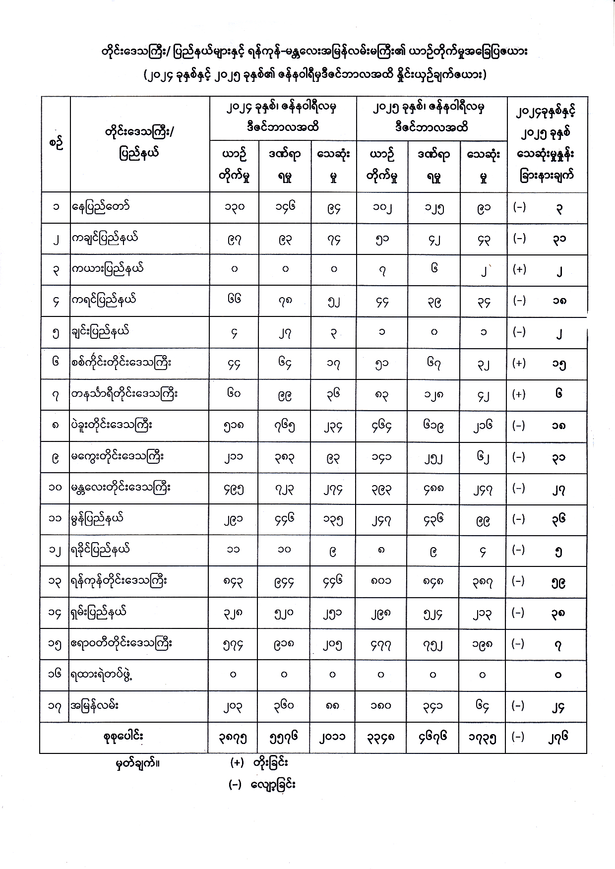 တိုင်းဒေသကြီး/ ပြည်နယ်များနှင့် ရန်ကုန်-မန္တလေးအမြန်လမ်းမကြီး၏ ယာဉ်တိုက်ခိုက်မှု အခြေပြဇယား(၂၀၂၄ ခုနှစ်နှင့် ၂၀၂၅ခုနှစ်၏ ဇန်နဝါရီလ မှ ဒီဇင်ဘာလအထိ နှိုင်းယှဉ်ချက်ဇယား) Published: 15 Jan, 2026 Place: ကုန်းလမ်းပို့ဆောင်ရေးညွှန်ကြားမှုဦးစီးဌာန