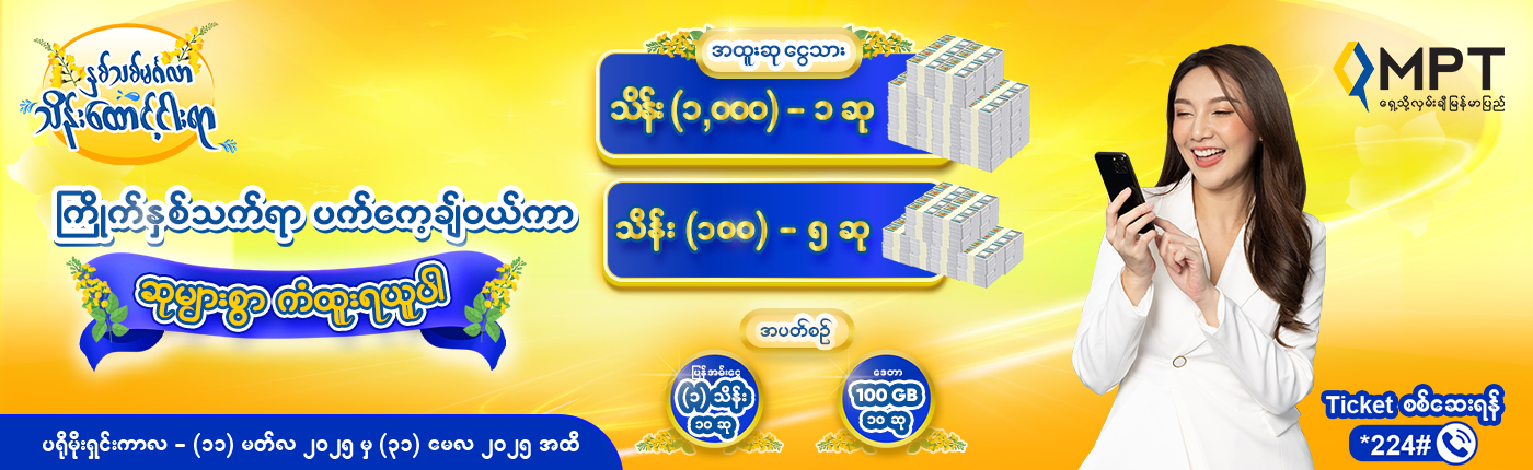 (ရန်ကုန်၊ ၂၀၂၅ ခုနှစ်၊ မတ်လ ၁၁ ရက်) –MPT သည် နိုင်ငံတစ်ဝန်းရှိ သုံးစွဲသူများသို့ ပိုမိုကောင်းမွန်သော ဝန်ဆောင်မှုများနှင့် ဆုလက်ဆောင်များပေးအပ်ရန်ဆိုသည့် ကတိကဝတ်ဖြင့် မြန်မာနှစ်သစ်တွင် “နှစ်သစ်မင်္ဂလာ သိန်းထောင့်ငါးရာ” ကံစမ်းမဲအစီအစဉ်ကို ဂုဏ်ယူစွာ မိတ်ဆက်လိုက်ပြီဖြစ်ပါသည်။ မကြာသေးမီက ဆောင်ရွက်ခဲ့သော ငွေသားဆုလက်ဆောင်များ ကံစမ်းပေးအပ်သည့် ကံထူးပျော်ရွှင်ဆုများစုံလင် အစီအစဉ်ကို အောင်မြင်စွာ ဆောင်ရွက်ခဲ့ပြီးသည့်နောက် MPT သည် နိုင်ငံတစ်ဝန်းရှိ ၎င်း၏ သုံးစွဲသူများအတွက် ပို၍ စိတ်လှုပ်ရှားဖွယ်ကောင်းသော ဆုလက်ဆောင်များ ပါဝင်သည့် “နှစ်သစ်မင်္ဂလာ သိန်းထောင့်ငါးရာ” ကံစမ်းမဲ အစီအစဉ်ကို ၂၀၂၅ ခုနှစ်၊ မတ်လ (၁၁) ရက်မှ မေလ (၃၁) ရက်ထိ ထပ်မံယူဆောင်လာပြီ ဖြစ်ပါသည်။