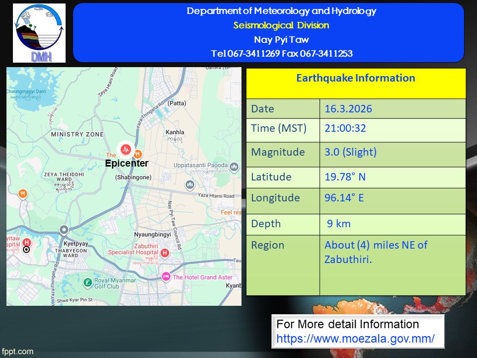 ဗဟိုချက်တည်နေရာ - ဇမ္ဗူသီရိမြို့နယ်၏ အရှေ့မြောက်ဘက် (၄) မိုင်ခန့်