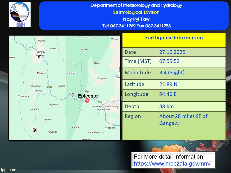 ၂၀၂၅ ခုနှစ်၊ အောက်တိုဘာလ ၂၇ ရက်နေ့၊ မြန်မာစံတော်ချိန် (၀၇)နာရီ၊ (၅၅)မိနစ်၊ (၅၂)စက္ကန့် အချိန်တွင် ညောင်ဦးမြေငလျင်စခန်းမှ မြောက်-အနောက်မြောက်ဘက် (၅၆) မိုင်ခန့် ကွာဝေးသော မြန်မာနိုင်ငံပြည်တွင်း (ဂန့်ဂေါမြို့၏ အရှေ့တောင်ဘက် (၂၈) မိုင်ခန့်အကွာ)၊ မြောက်လတ္တီတွဒ် (၂၁.၈၉) ဒီဂရီ၊ အရှေ့ လောင်ဂျီတွဒ် (၉၄.၄၆) ဒီဂရီ၊ အနက် (၃၈)ကီလိုမီတာကို ဗဟိုပြု၍ အင်အားရစ်(ခ်)တာစကေး (၃.၄)အဆင့်ရှိ အင်အားအနည်းငယ်ရှိသော မြေငလျင်တစ်ခု လှုပ်ရှားသွားကြောင်း တိုင်းထွာရရှိပါသည်။