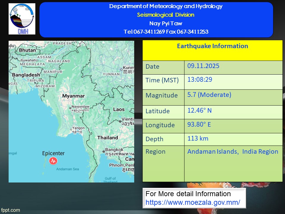 ၂၀၂၅ ခုနှစ်၊ နိုဝင်ဘာလ ၉ ရက်နေ့၊ မြန်မာစံတော်ချိန် (၁၃) နာရီ၊ (၀၈) မိနစ်၊ (၂၉) စက္ကန့် အချိန်တွင် ကမ္ဘာအေးမြေငလျင်စခန်းမှ အနောက်တောင်ဘက် မိုင် (၃၄၀) ခန့်ကွာဝေးသော မြန်မာနိုင်ငံပြည်ပ (Andaman Islands, India Region)၊ မြောက်လတ္တီတွဒ် (၁၂.၄၆) ဒီဂရီ၊ အရှေ့လောင်ဂျီတွဒ် (၉၃.၈၀) ဒီဂရီ၊ အနက် (၁၁၃) ကီလိုမီတာခန့်ကို ဗဟိုပြု၍ အင်အား ရစ်(ခ်)တာ စကေး (၅.၇) အဆင့်ရှိ အင်အားအသင့်အတင့်ရှိသော မြေငလျင်တစ်ခု လှုပ်ရှားသွား ကြောင်း တိုင်းထွာရရှိပါသည်။