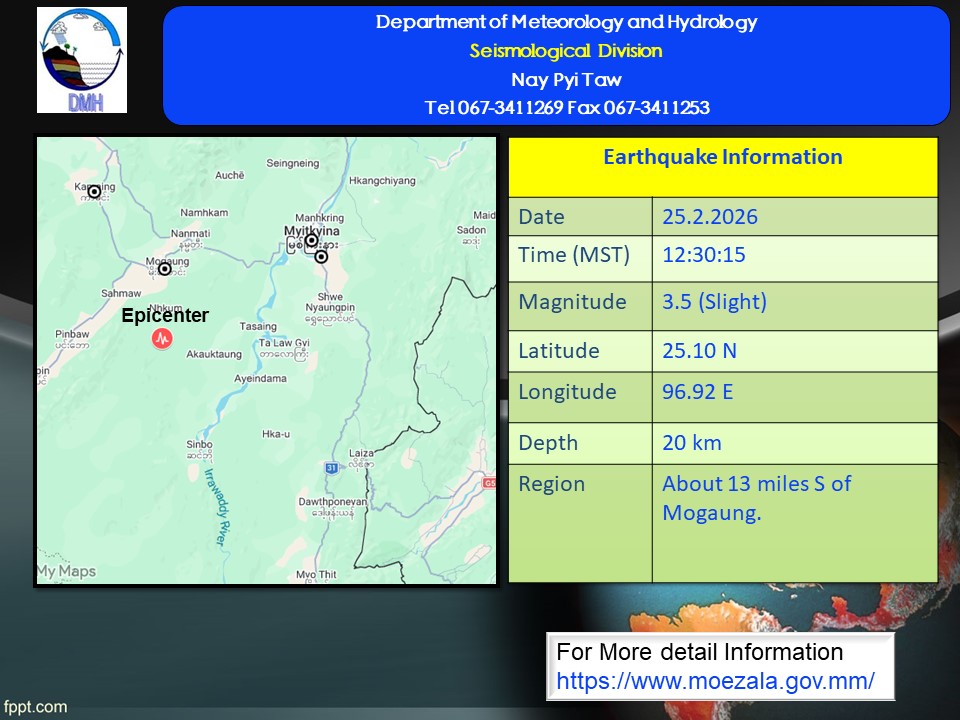 ၂၀၂၆ ခုနှစ်၊ ဖေဖော်ဝါရီလ ၂၅ ရက်နေ့၊ မြန်မာစံတော်ချိန် (၁၂)နာရီ၊ (၃၀)မိနစ်၊ (၁၅)စက္ကန့် အချိန်တွင် မြစ်ကြီးနားမြေငလျင်စခန်းမှ အနောက်တောင်ဘက် (၃၅) မိုင်ခန့် ကွာဝေးသော မြန်မာနိုင်ငံပြည်တွင်း (မိုးကောင်းမြို့၏ တောင်ဘက် (၁၃) မိုင်ခန့်အကွာ)၊ မြောက်လတ္တီတွဒ် (၂၅.၁၀) ဒီဂရီ၊ အရှေ့လောင်ဂျီတွဒ် (၉၆.၉၂) ဒီဂရီ၊ အနက် (၂၀) ကီလိုမီတာကို ဗဟိုပြု၍ အင်အားရစ်(ခ်)တာစကေး (၃.၅)အဆင့်ရှိ အင်အားအနည်းငယ်ရှိသော မြေငလျင်တစ်ခု လှုပ်ရှားသွားကြောင်း တိုင်းထွာရရှိပါသည်။