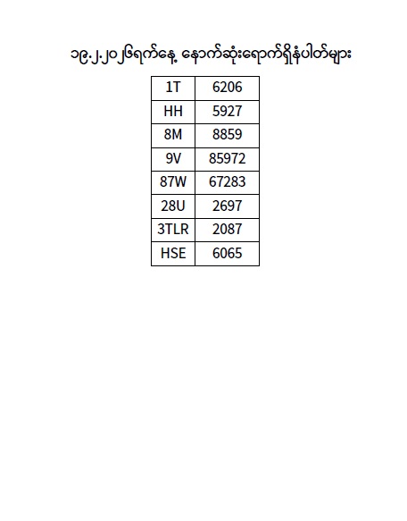 ၁၉.၂.၂၀၂၆ ရက်နေ့ထိ နောက်ဆုံးရောက်ရှိ နံပါတ်များ Published: 20 Feb, 2026 Place: ကုန်းလမ်းပို့ဆောင်ရေးညွှန်ကြားမှုဦးစီးဌာန