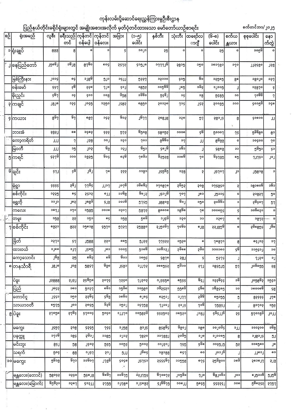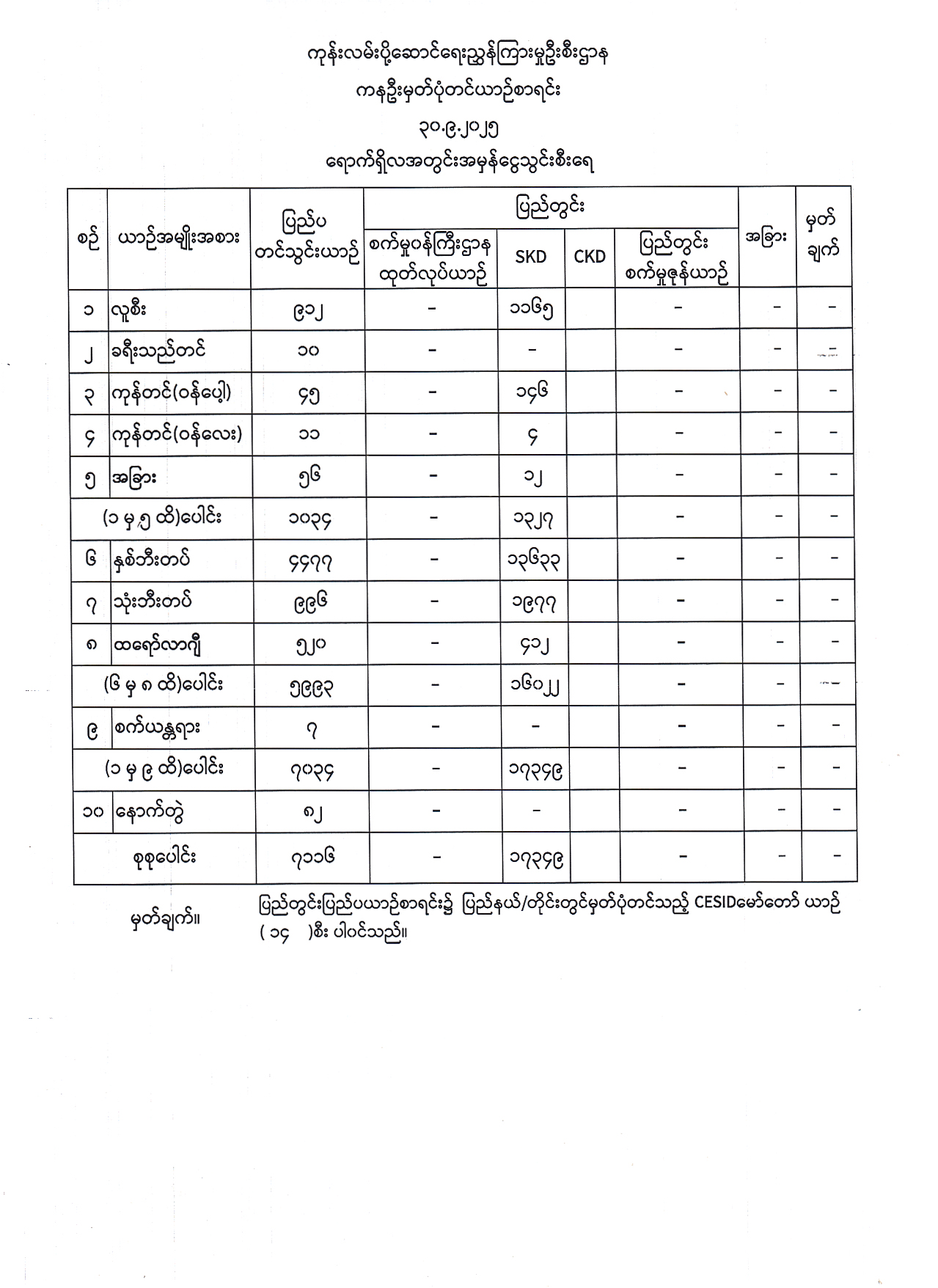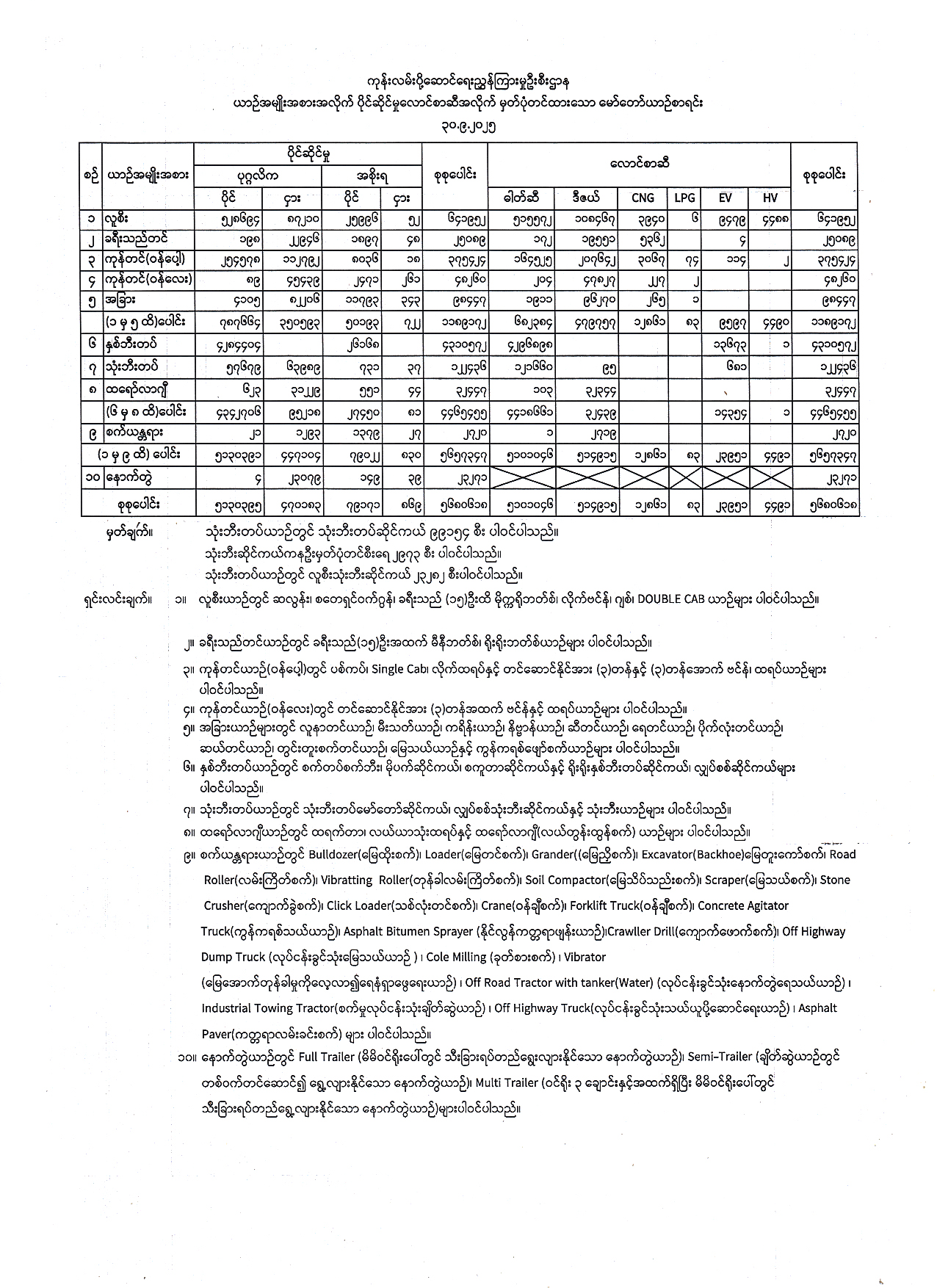 ၂၀၂၅ ခုနှစ်၊ စက်တင်ဘာလအထိ ပြည်နယ်တိုင်းခရိုင်ရုံးများတွင် အမျိုးအစားအလိုက် မှတ်ပုံတင်ထားသော မော်တော်ယာဉ်စာရင်း Published: 02 Oct, 2025 Place: ကုန်းလမ်းပို့ဆောင်ရေးညွှန်ကြားမှုဦးစီးဌာန